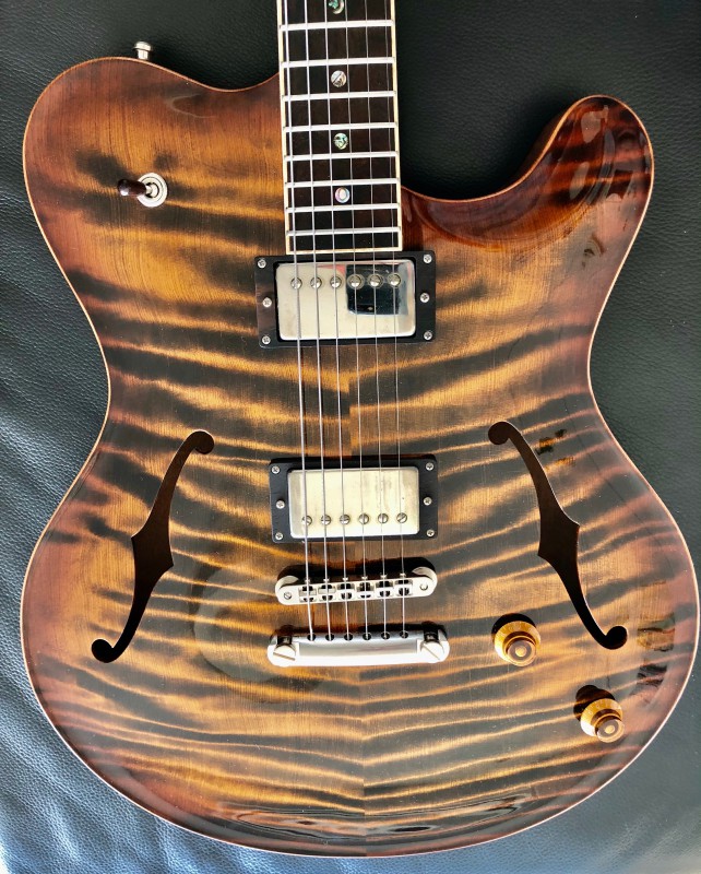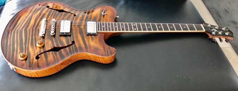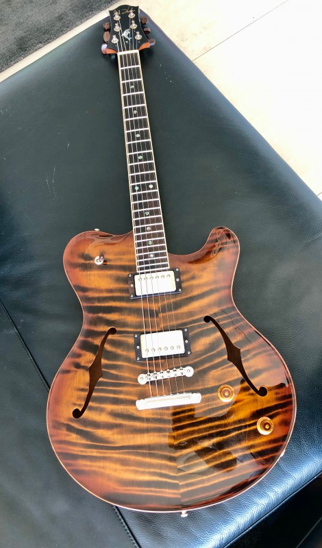 Pour ceux qui connaissent et qui s’intéressent donc aux belles guitares, cette Nik Huber est une Hollowbody avec toutes les options haut de gamme de la marque.