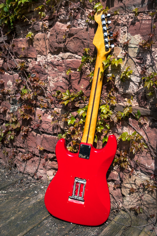 Sinon à part ça, elle est en superbe état ! Le vernis du corps a vieilli naturellement, perso j'adore. Il est très légèrement "ondulé", selon la lumière et la position de la gratte on peut l'apercevoir. Il a y a un ou deux petits accrocs ci et là mais franchement c'est très minime. Ne me demandez pas la nature du bois du corps...je n'en sais rien, je pencherais pour du contreplaqué (?). Le corps est aussi plus fin que ma Vintage Modified. L'accastillage, c'est bas de gamme de l'époque, mais franchement elle tient mieux l'accord que ma VM ! Et le vibrato est utilisable pour le coup (la tige est bien évidemment fournie). Le manche est magnifique, franchement à lui seul la gratte vaut le coup. Une pièce d'érable, vernis fin (comme sur le corps d'ailleurs, bien plus fin que sur ma MV), orangé par le temps, subjectivement je trouve ça sublime. Il est en très bel état, les frettes aussi, et il est même un peu flammé à l'arrière ! L'électronique est en très bel état, pas de problèmes. Les potards on l'air de bonne qualité d'ailleurs. Micros céramiques, tout est d'origine.