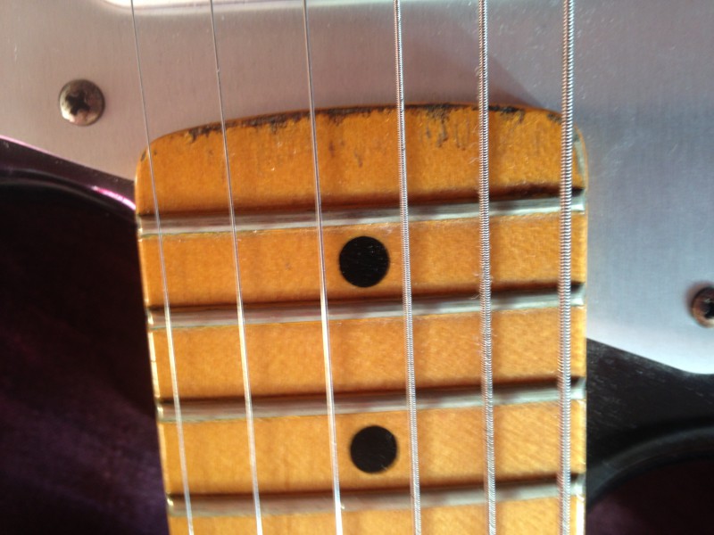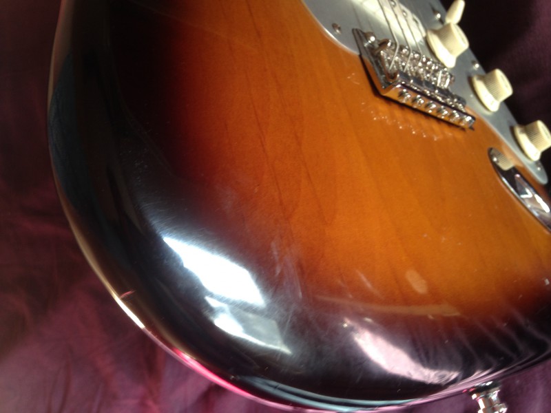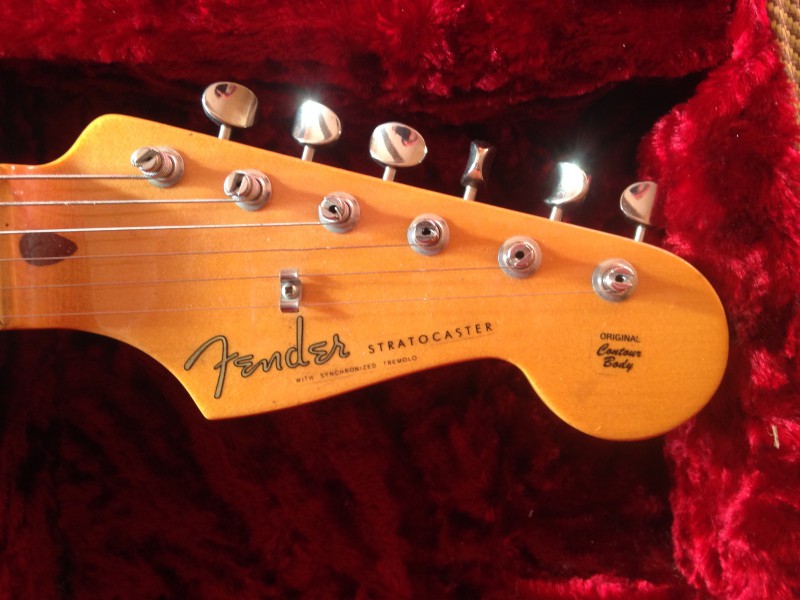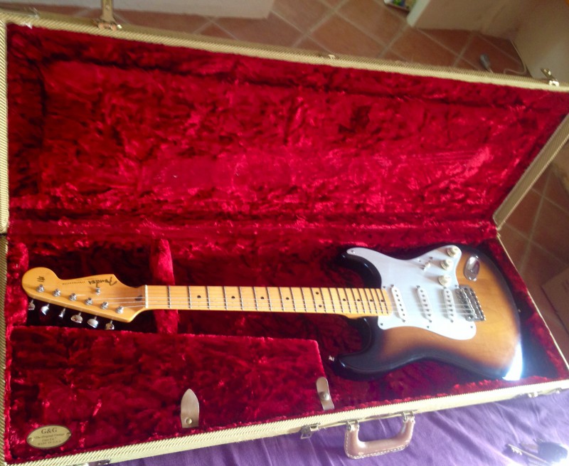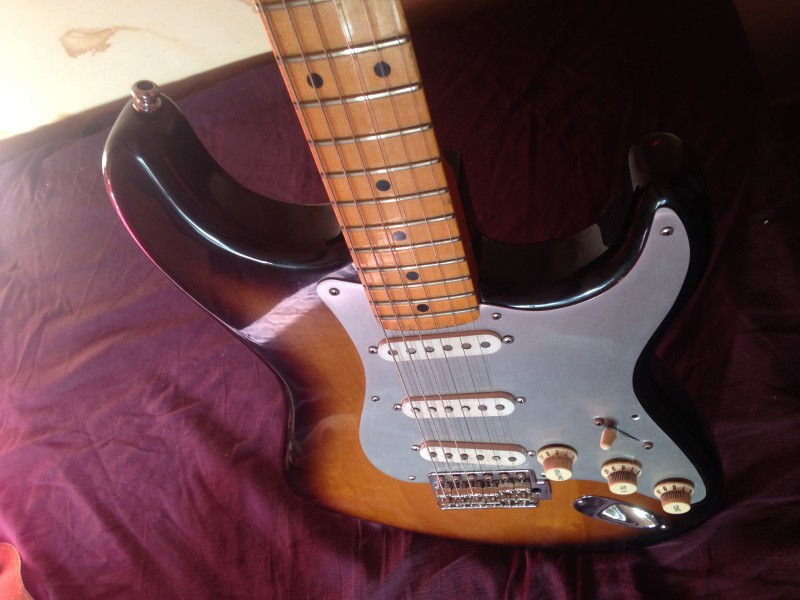 On a donc un sunburst 2 tons et un vernis nitro, assez patiné et avec quelques pocs dus à 13 ans d'usage, un manche érable touche érable en une piece , le manche le plus sympa et leplus rapide que j'ai joué sur strat, sillet os, mécaniques Kluson vintage, bref toutes les propriétés d'une strat 57.