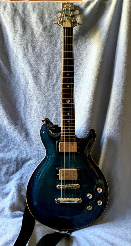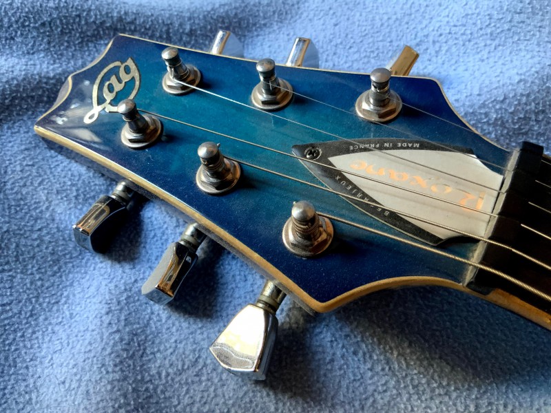 Lag Roxane (année de transition des deux NN vers le N ) faite à feu l’atelier de Bedarieux. Touche ébène, table en érable flammé à tomber, binding du manche en érable flammé à tomber aussi. Blue burst magnifique, micro seymour, mais je sais pas lesquels, souvent c’était les’sh2/sh4, mais pas certain.