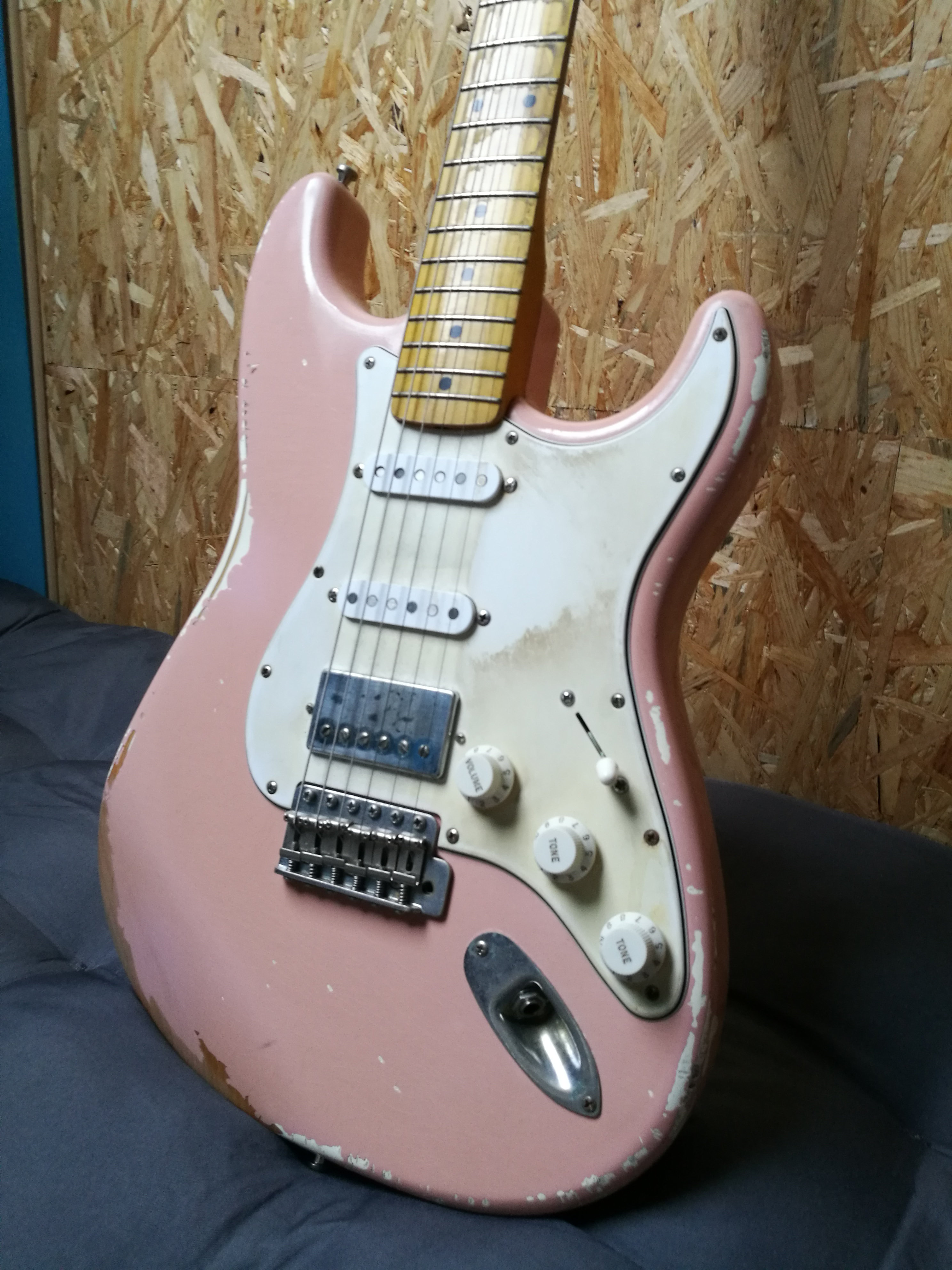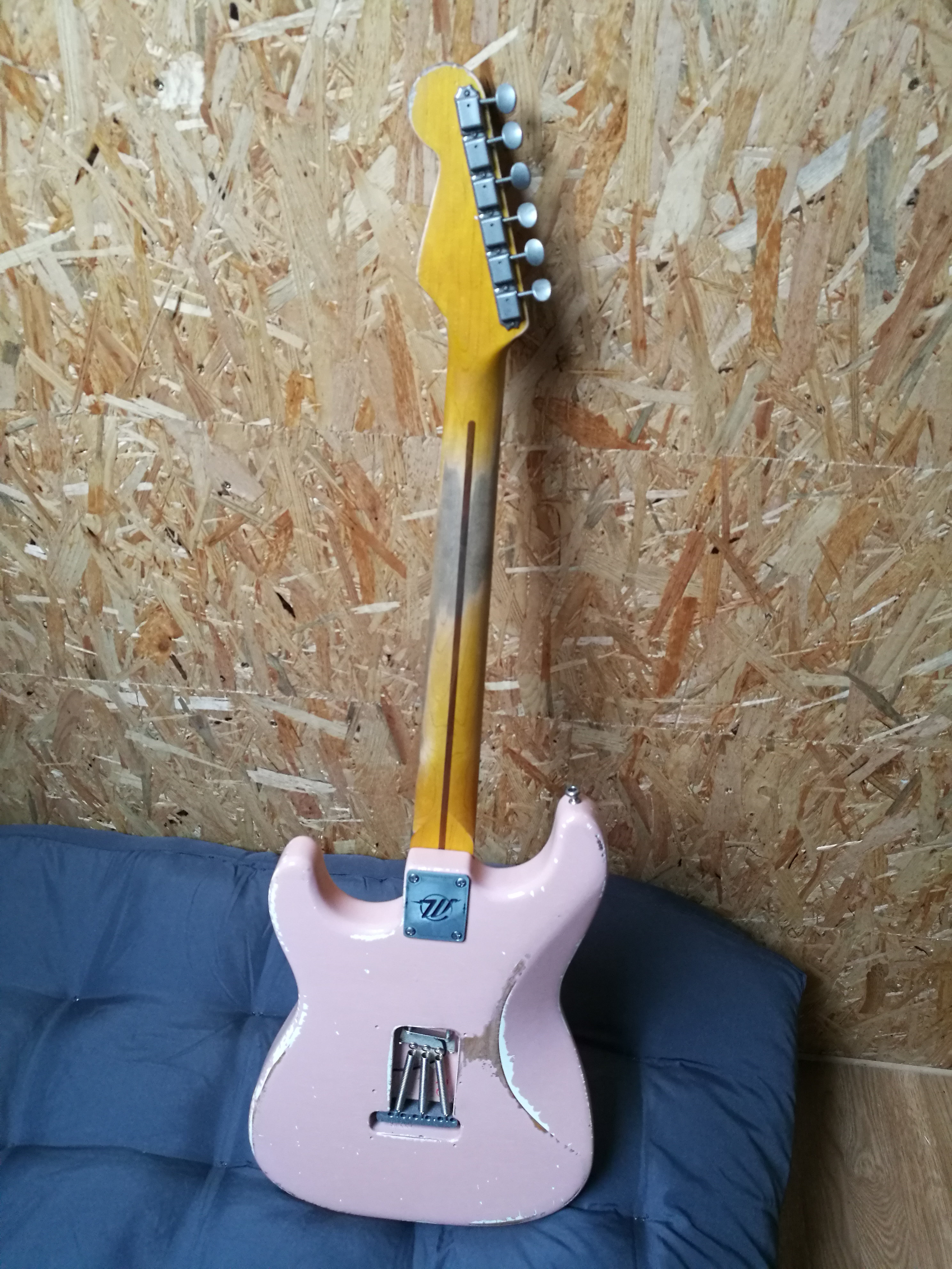 Je propose à la vente ou à l'échange, uniquement contre une autre gratte électrique d'à peu près même valeur (ou un peu inférieur avec compensation), cette Partcaster Shell Pink.