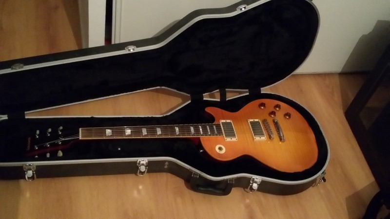 Je la fournis avec un case Gator qui fait le taf. J'ai aussi le pickguard, qui est démonté en ce moment (effet Gary Moore).