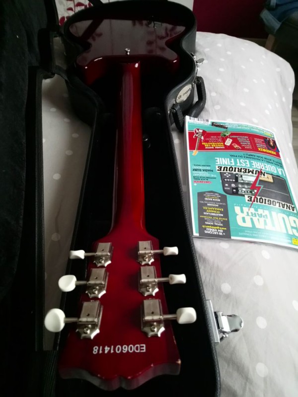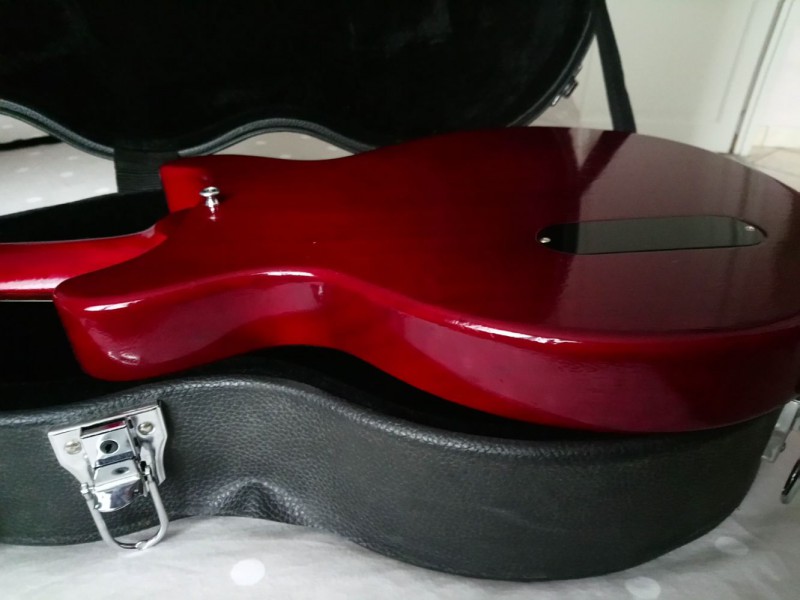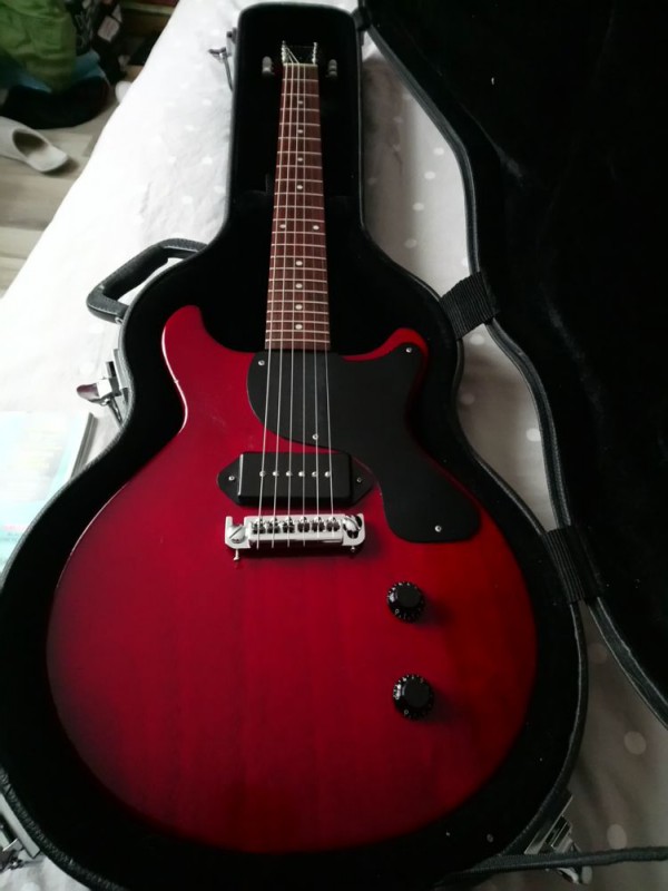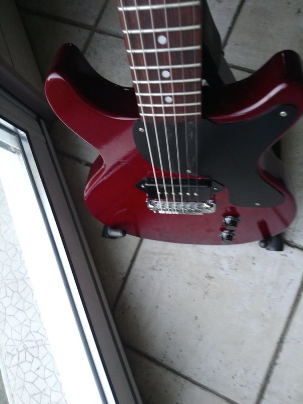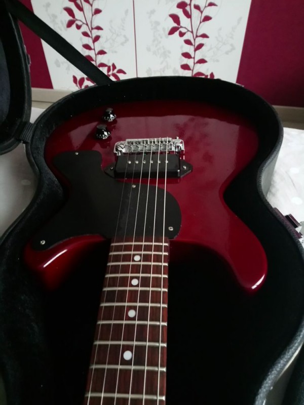 Bonjour, à vendre une Edwards les paul junior dc , très légère et résonnante. 3.3kgs Frettes ok. Très bon état livrée avec un étui rigide adapté à la guitare. Cherry red, micro sp90 seymour duncan.