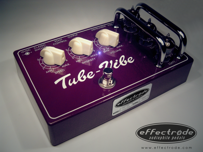 All Tube: Circuitry for the ultimate in audiophile performance!—low background noise and stacks of headroom. The Tube-Vibe takes single coil or humbucker pickups extremely well—the pedal ships with a 12AU7 tube in its input stage so has ample headroom for stunning, clean Vibe tones. However, you can swap out the 12AU7 out for other 9-pin varieties with a higher gain factor such as 12AY7 or 12AX7 to create more of a Leslie-style growl or push your favourite vintage/boutique tube amp into overdrive for some seriously thick/sustaining tones.