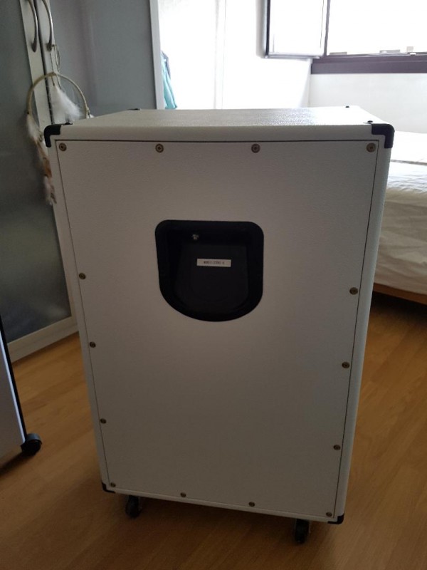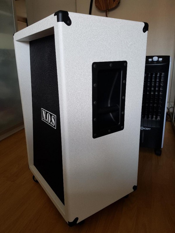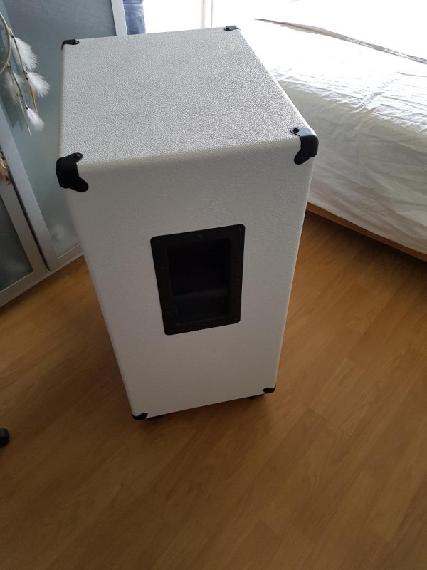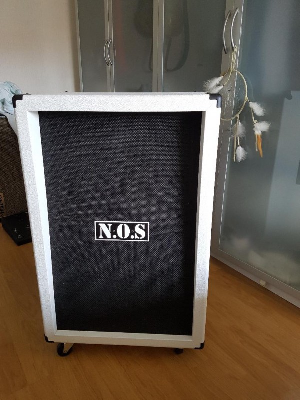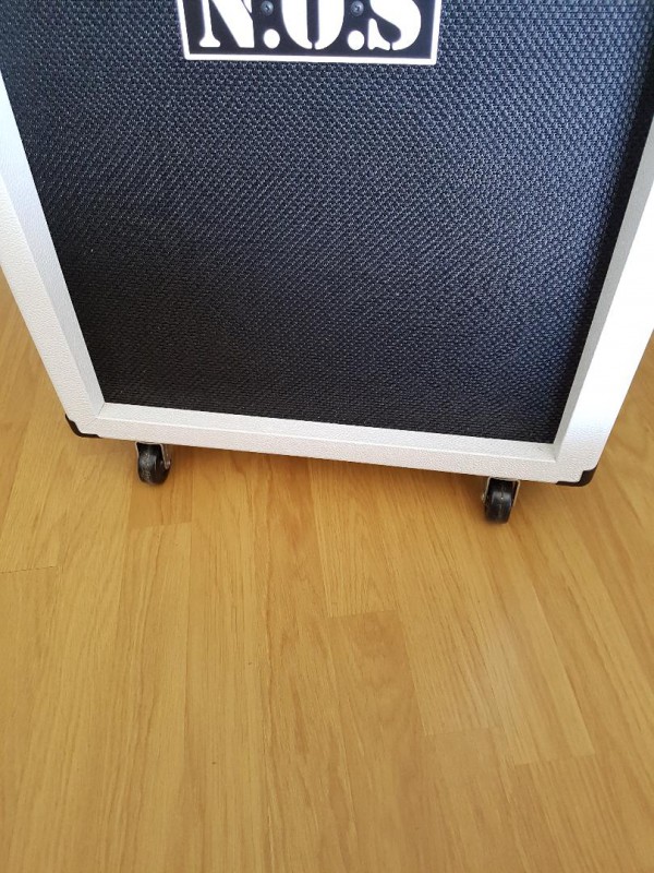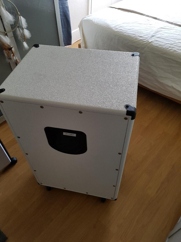 Je vends un cab NAME OF SOUND 2x12 blanc 2 V30 CELESTION inclinés.