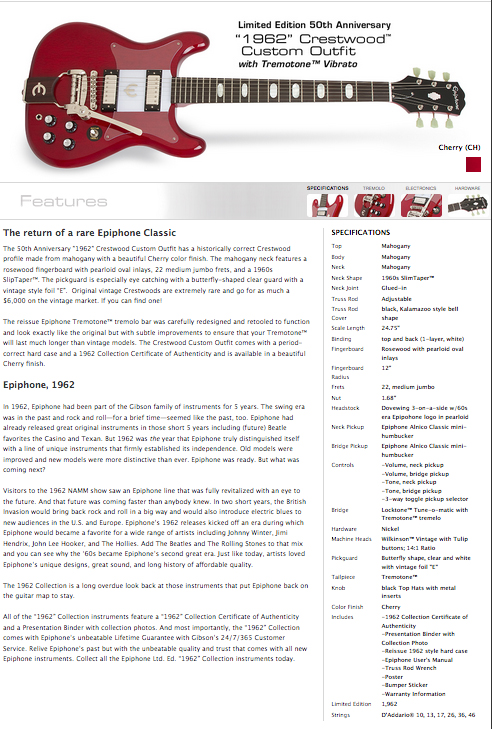 Je vends mon Epiphone Crestwood Custom 50th anniversary, elle fait partie de la série des "1962 50th anniversary Collection" avec les Sheraton et Sorrento sorties exclusivement en 2012, à 1962 exemplaires chacune.