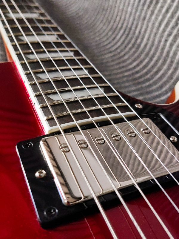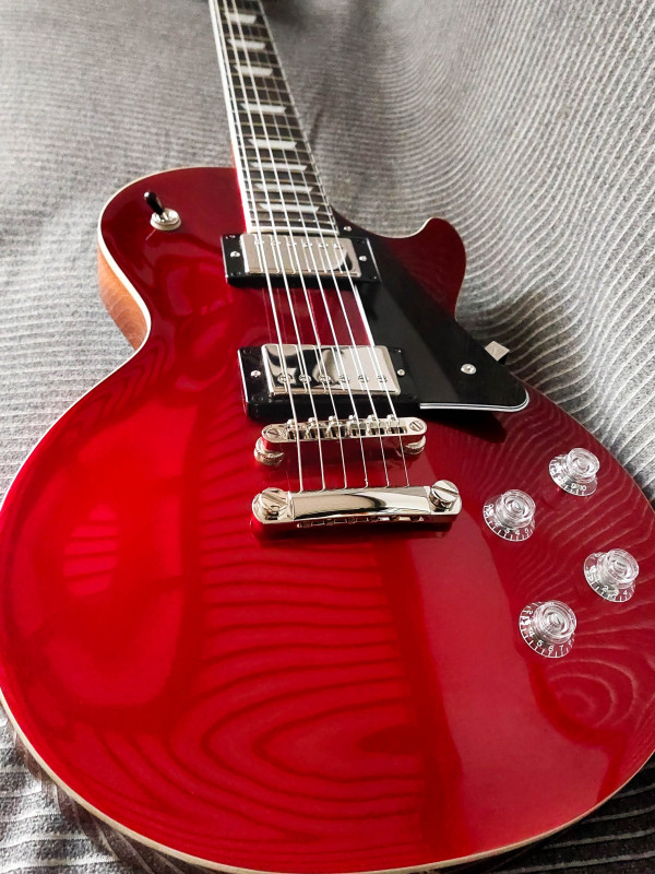 Je vends ma Epiphone Les Paul Modern Sparkling Burg achetée neuve chez Music Audio Shop situé à Bordeaux.