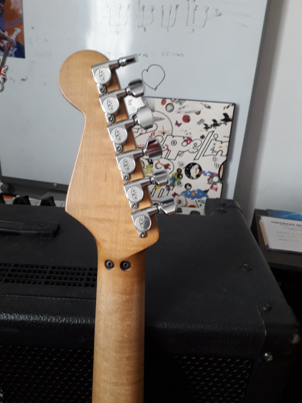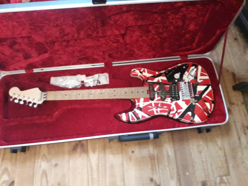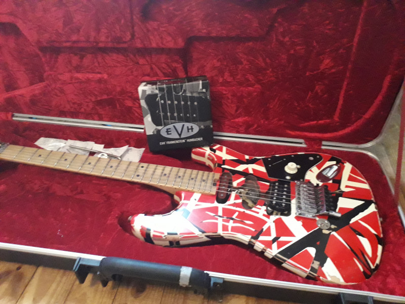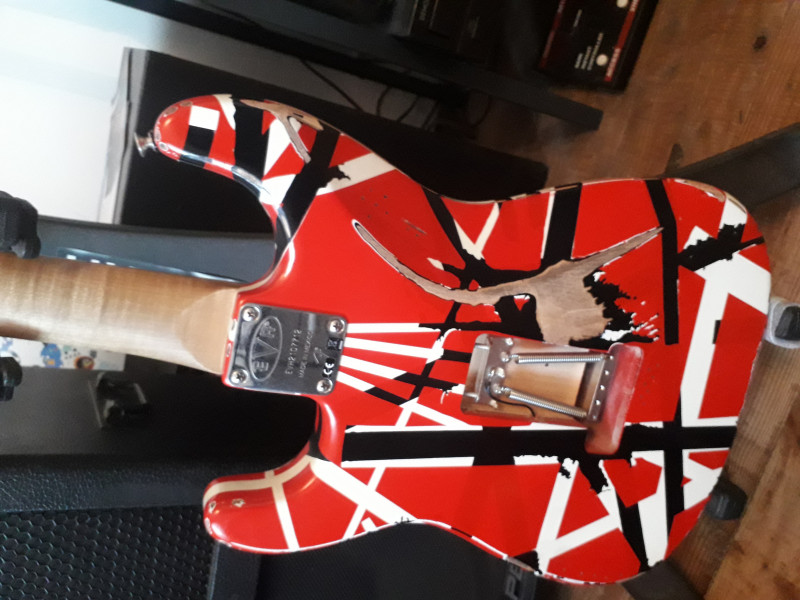 Le logo EVH sur la tête a été supprimé parce que je trouve mieux comme ça (plus proche de l’originale). Le manche n’est pas noir comme certains exemplaires.