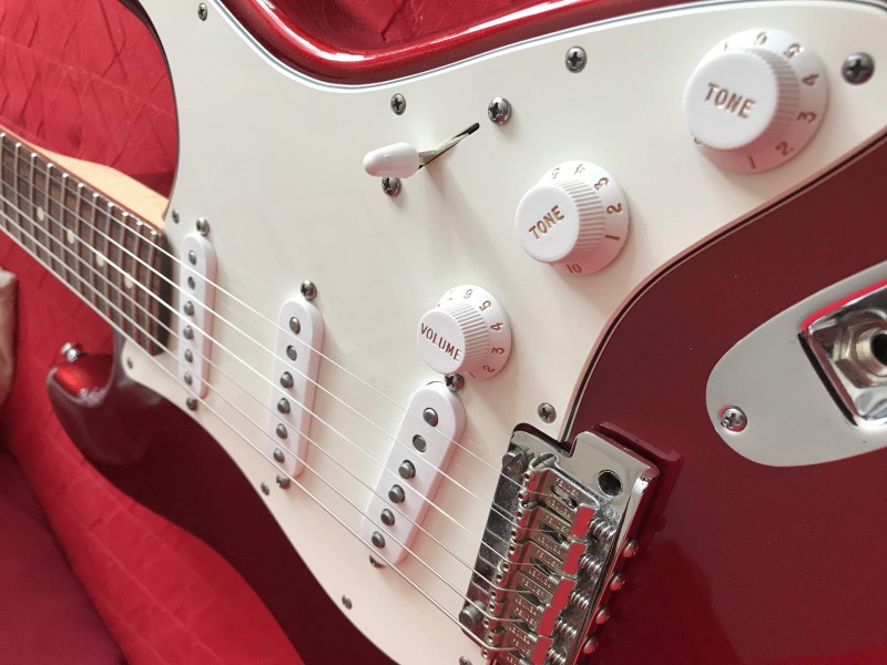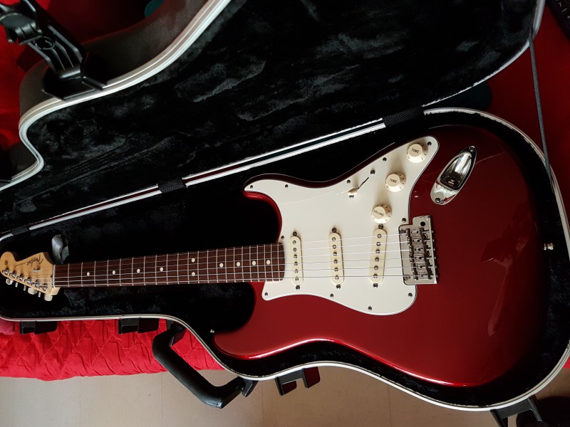 candy cola Année 2013,Comme neuve aucun poc ou rayure ,frettes comme neuve . Micros fender fat 60( les micros d origine fat 50 non dispos) avec etui tsa rectangulaire d origine(pas celui de la photo). Remise en mains propres uniquement a mon domicile, essai possible sur ampli hugues and ketnner, photos supp sur demande.[img]