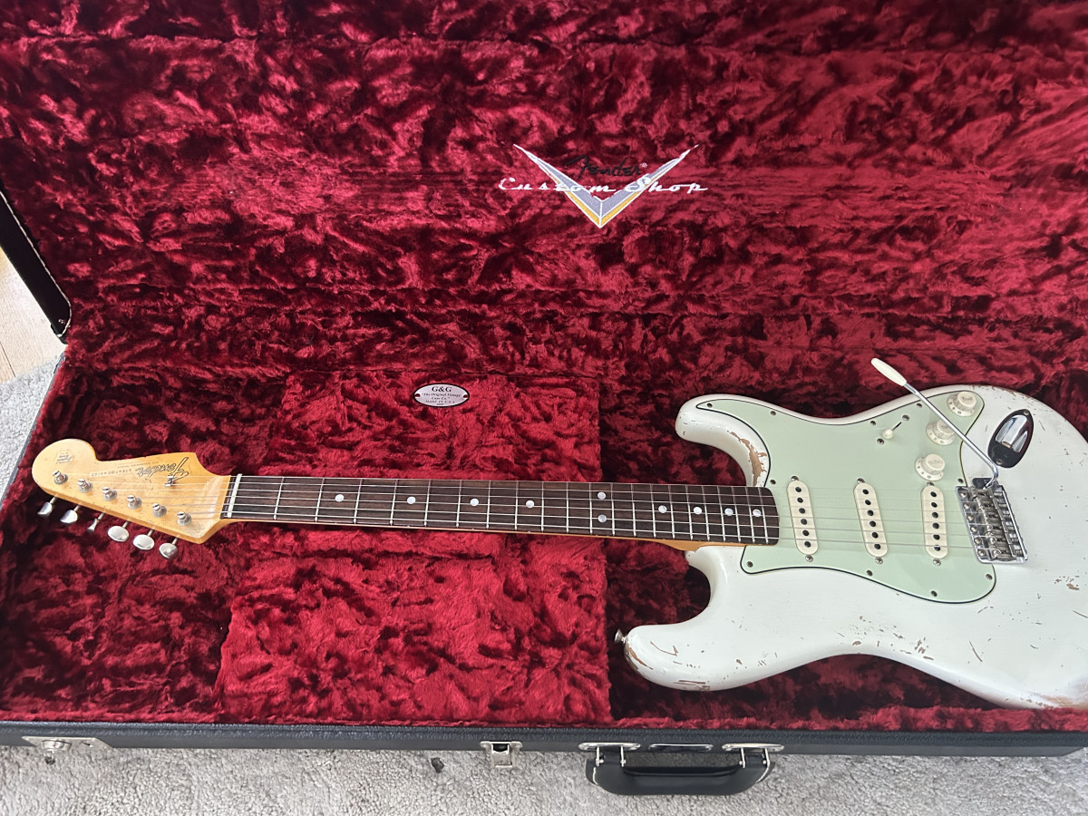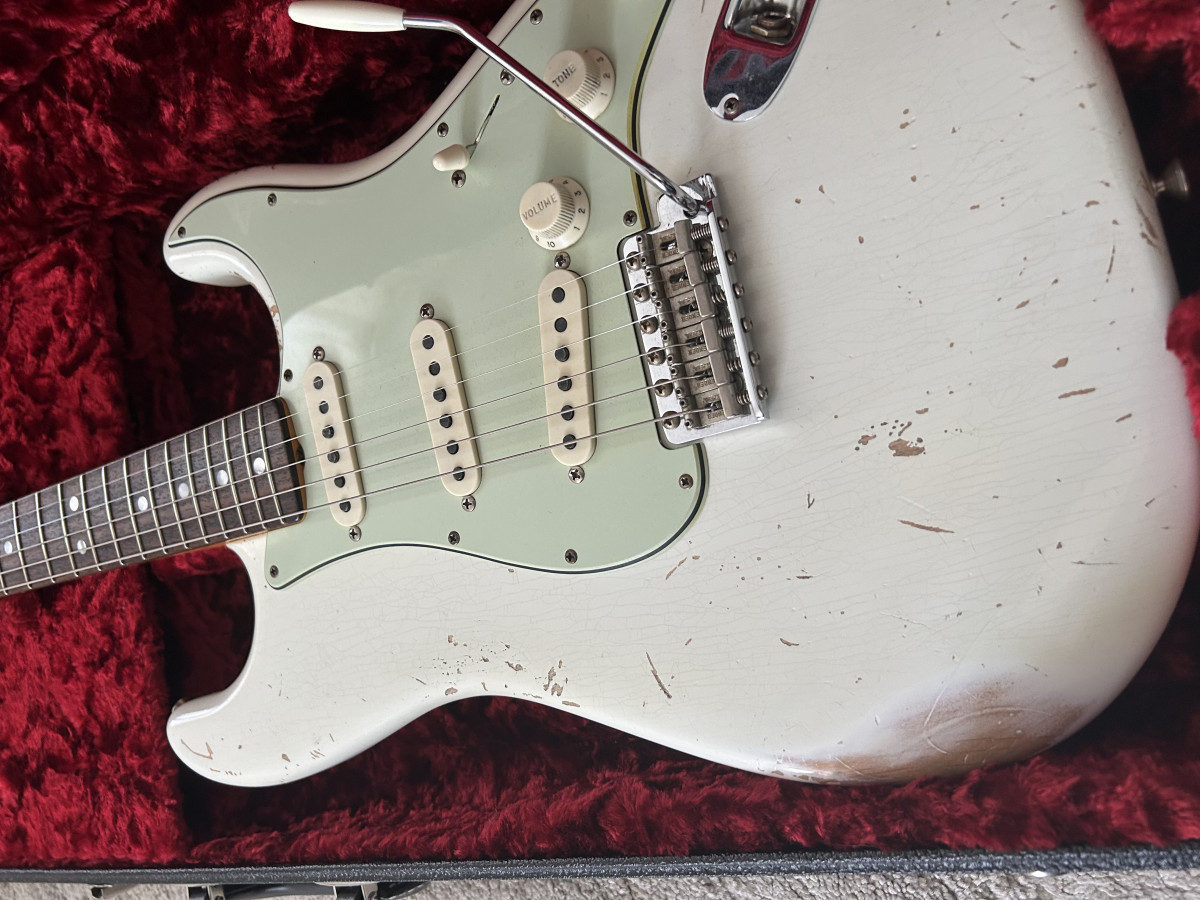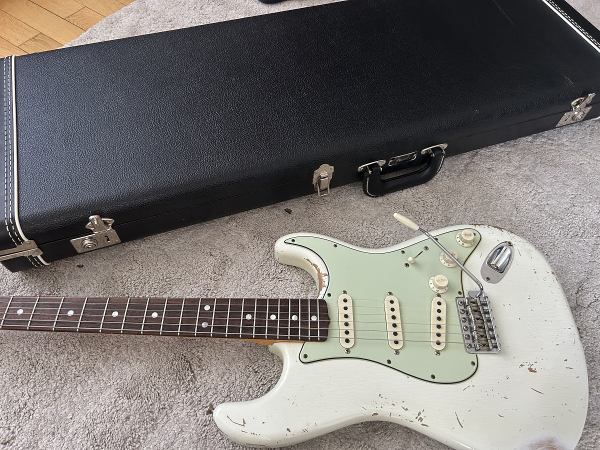 On sent qu’on a affaire à une guitare de maître, largement au dessus des Strat custom. Finition Olympic White nitro relic, micros Josefina bobinés main, touche palissandre AAA, état mint (comme neuve, relic d’usine uniquement).