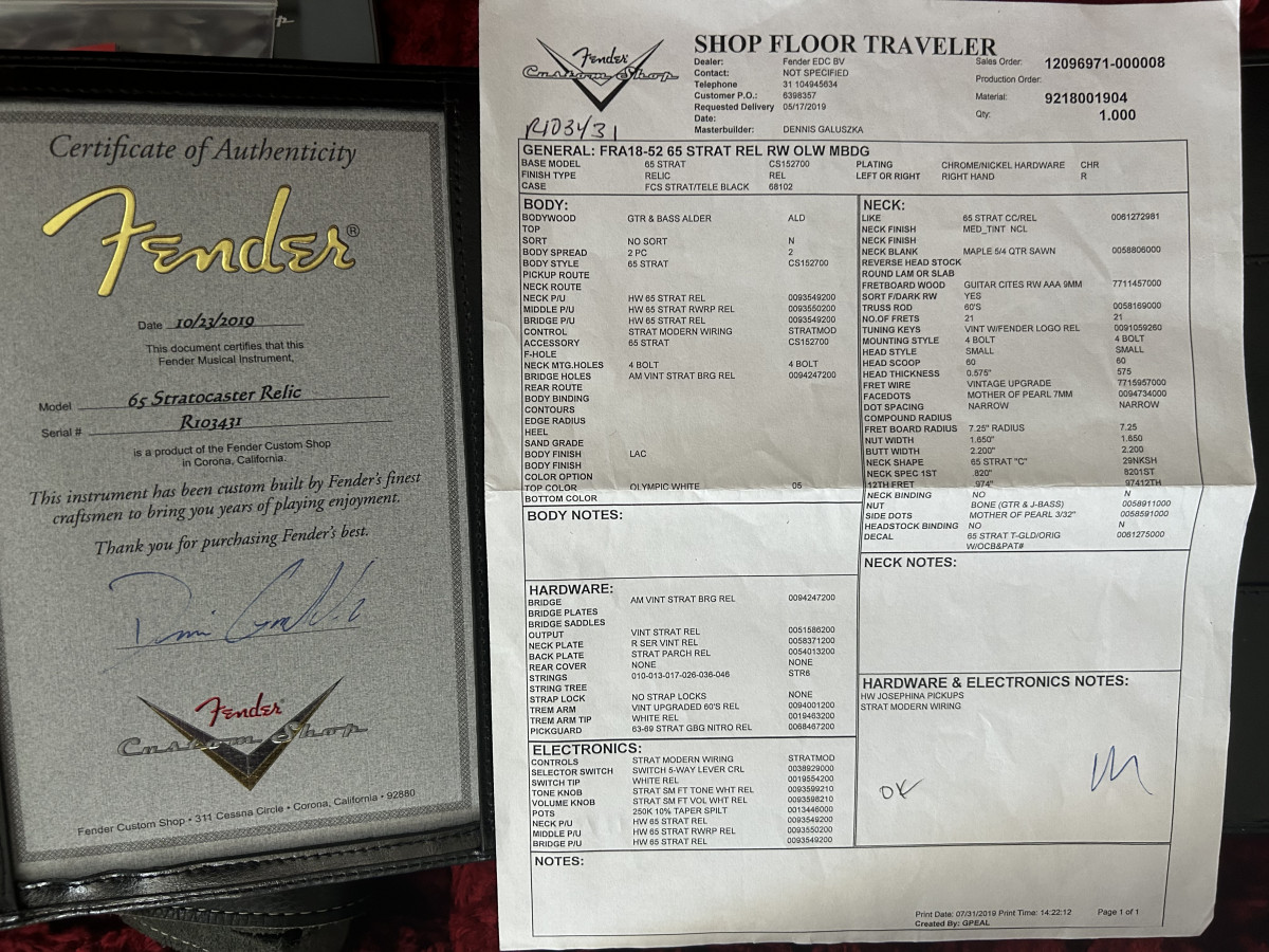 Caractéristiques : • Masterbuilt par Dennis Galuszka • Corps : aulne sélectionné • Manche : érable quartersawn, profil “Mid-60s Oval C” • Touche : palissandre AAA, radius 7.25” • Micros : Josefina Handwound ’65 Strat • Câblage Strat moderne (5 positions) • Vibrato style vintage relic ? Inclus : • Étui Fender Custom Shop (noir tolex) • Certificat d’authenticité • Shop Floor Traveler • Bras de vibrato, sangle Fender • Tous les accessoires et papiers d’origine ?