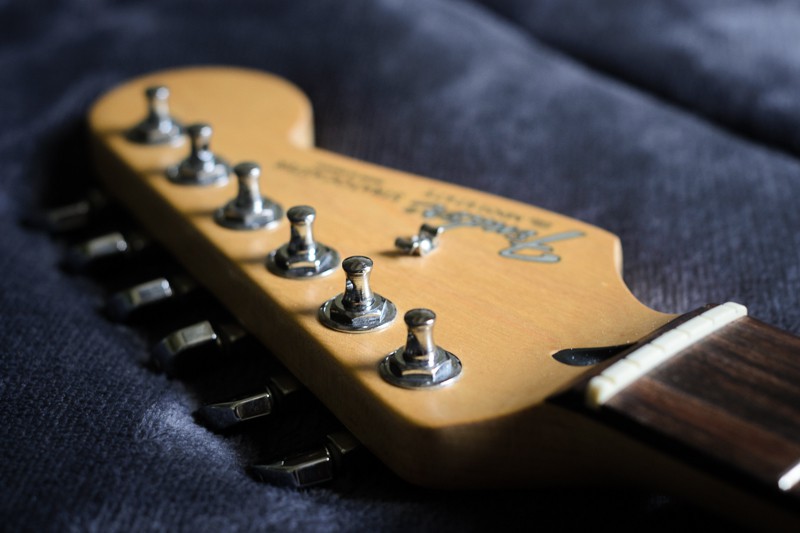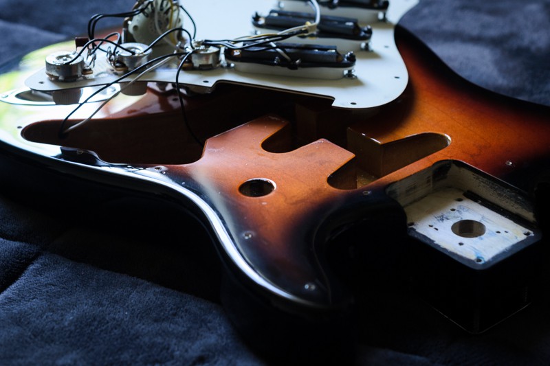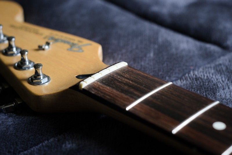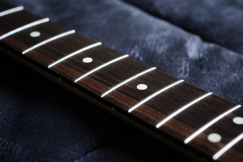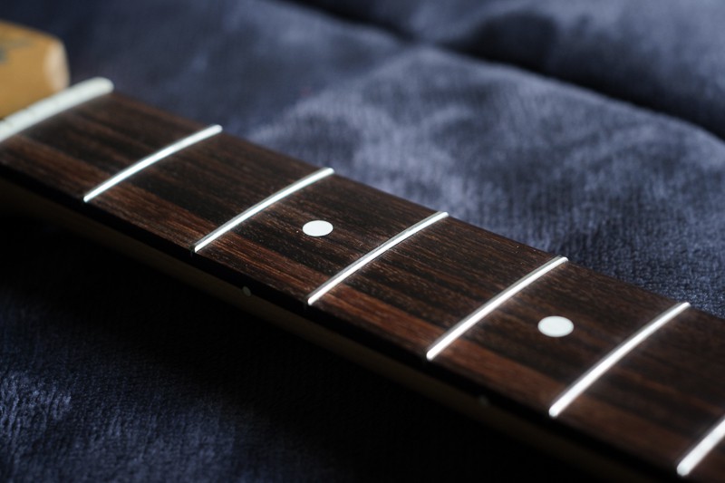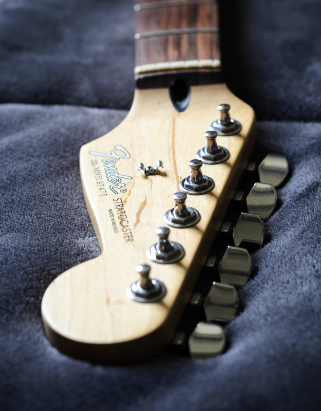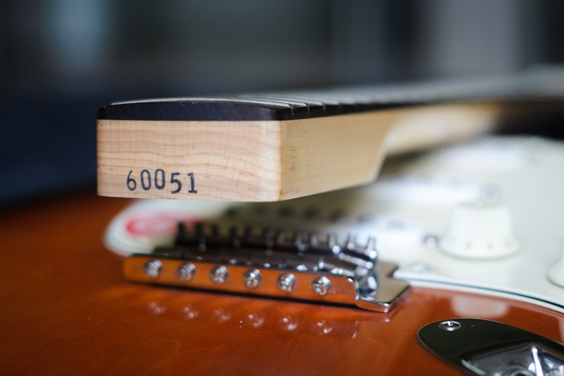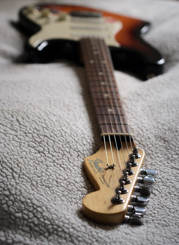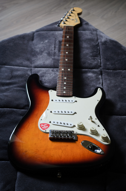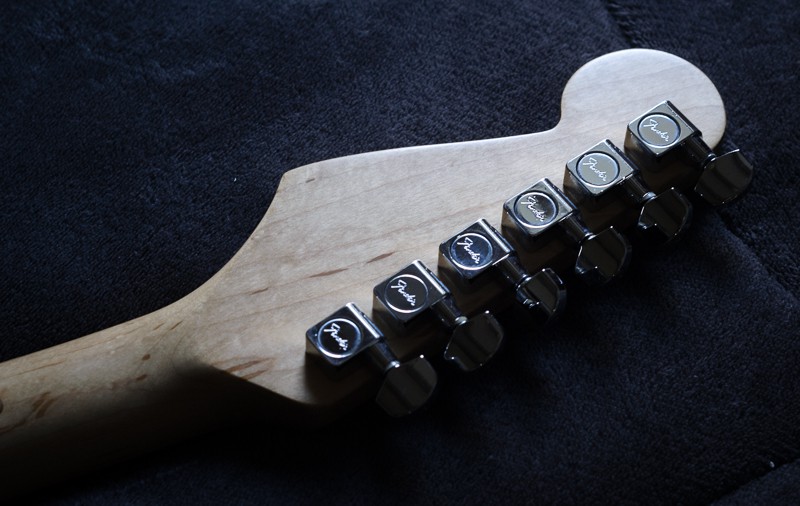 Je l'avais achetée ainsi d'occaze, mais j'ai déjà une strat' destroy que j'adore et j'ai surtout trop peur d'abîmer celle ci...je préfère qu'elle profite à quelqu'un d'autre qui la jouera et en fera bon usage, elle le mérite bien ! Elle a été très très peu jouée vous l'aurez compris, les frettes sont donc en parfait état, aucun poc’ à signaler, aucune rayure. Il ne manque que la tige vibrato (à moins que je la retrouve). Bien réglée, action basse (je ne suis pas luthier ceci dit !). Je souhaitais changer les cordes et la prendre en photo de long en large et en travers, donc je les ai coupées puis enlevées… j’étais persuadé d’en avoir un jeu en rab’, mais impossible de mettre la main dessus ! Donc s’il y a des intéressés, il faudra attendre quelques jours que je puisse remonter un set tout neuf (je pourrais même vous envoyer une petite vidéo si besoin et si vraiment intéressé une fois les cordes montées).