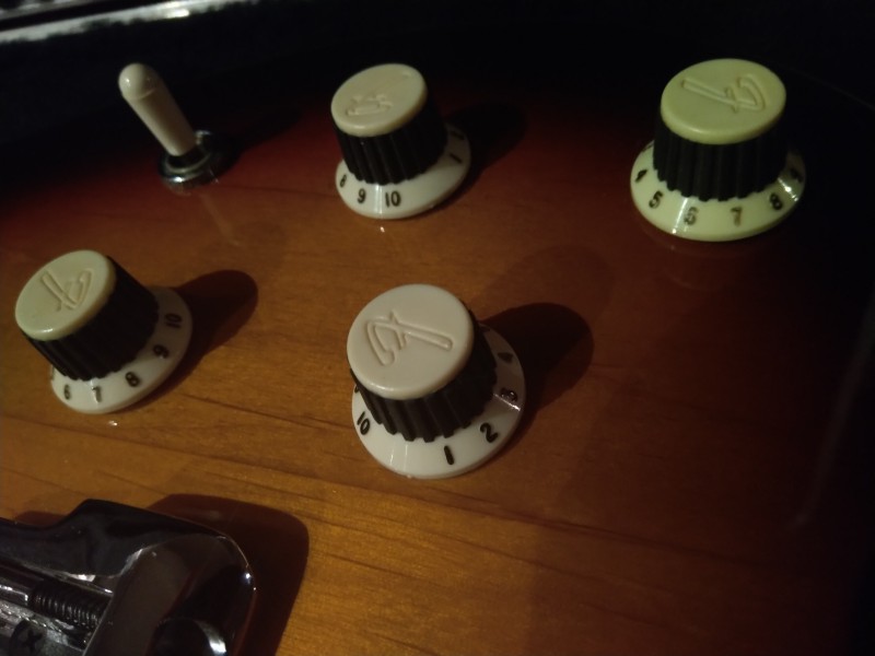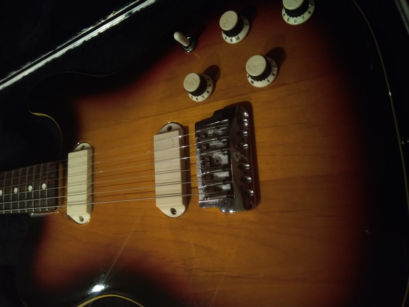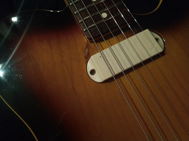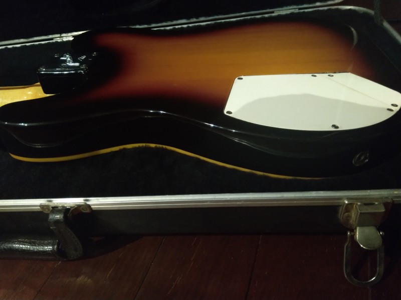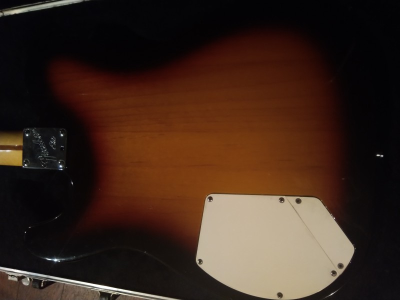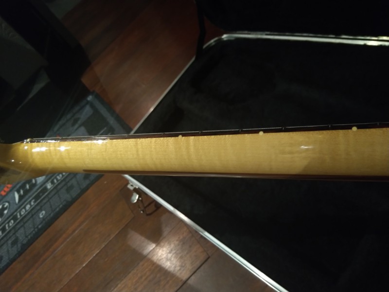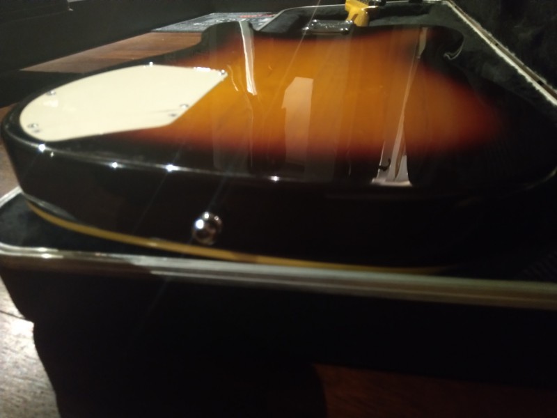 Tout est d'origine, excellent état malgré le pèt au-dessus du micro manche et la fissure sur la plaque arrière (très fréquent sur ce modèle). Le manche flammé (pas facile à attraper en photo) est magnifique et comme neuf.
