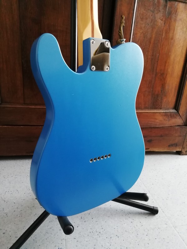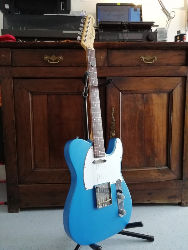 Refin en lake placid blue (peinture nitro) et upgrade micros Q pickups Broadcaster, pontets en laiton.