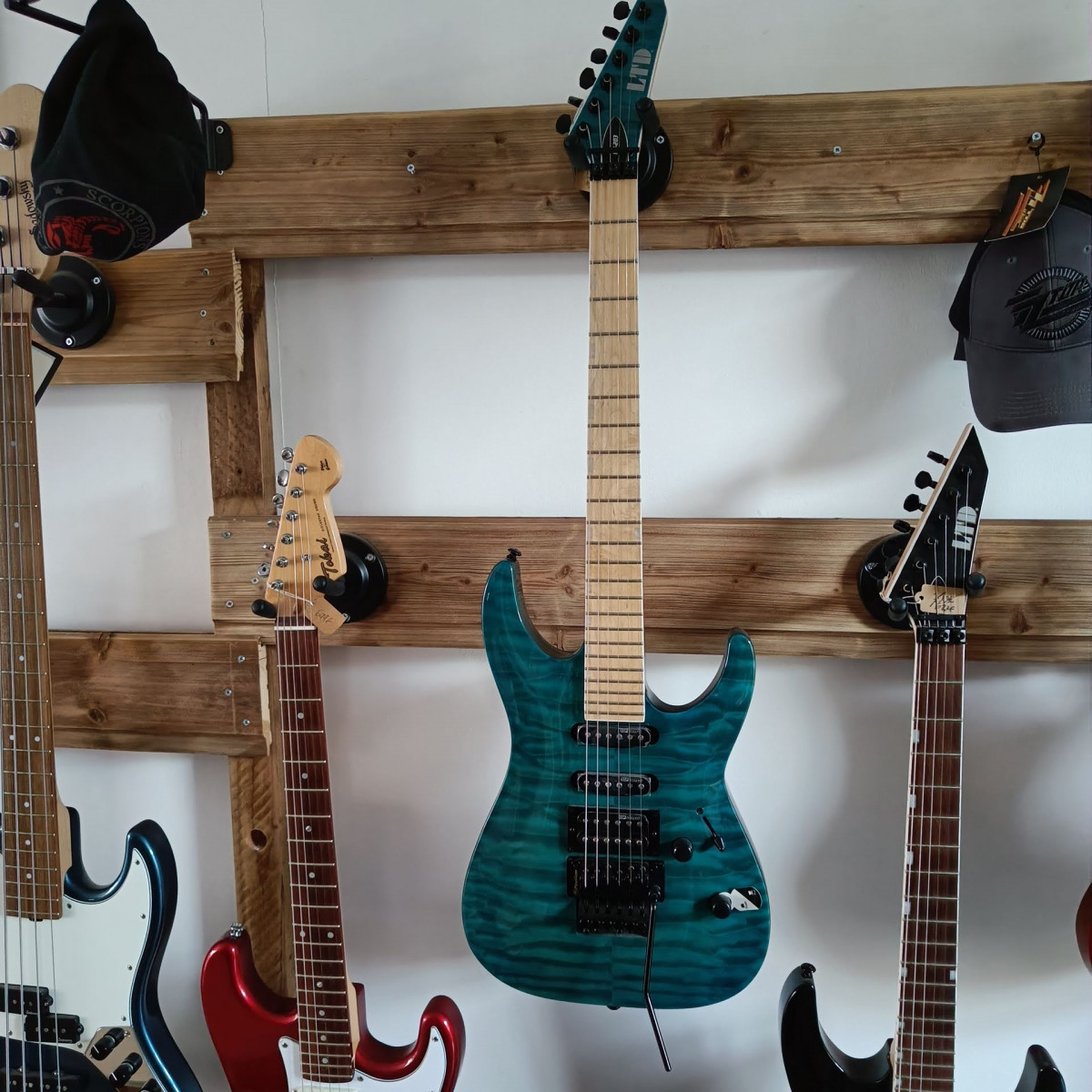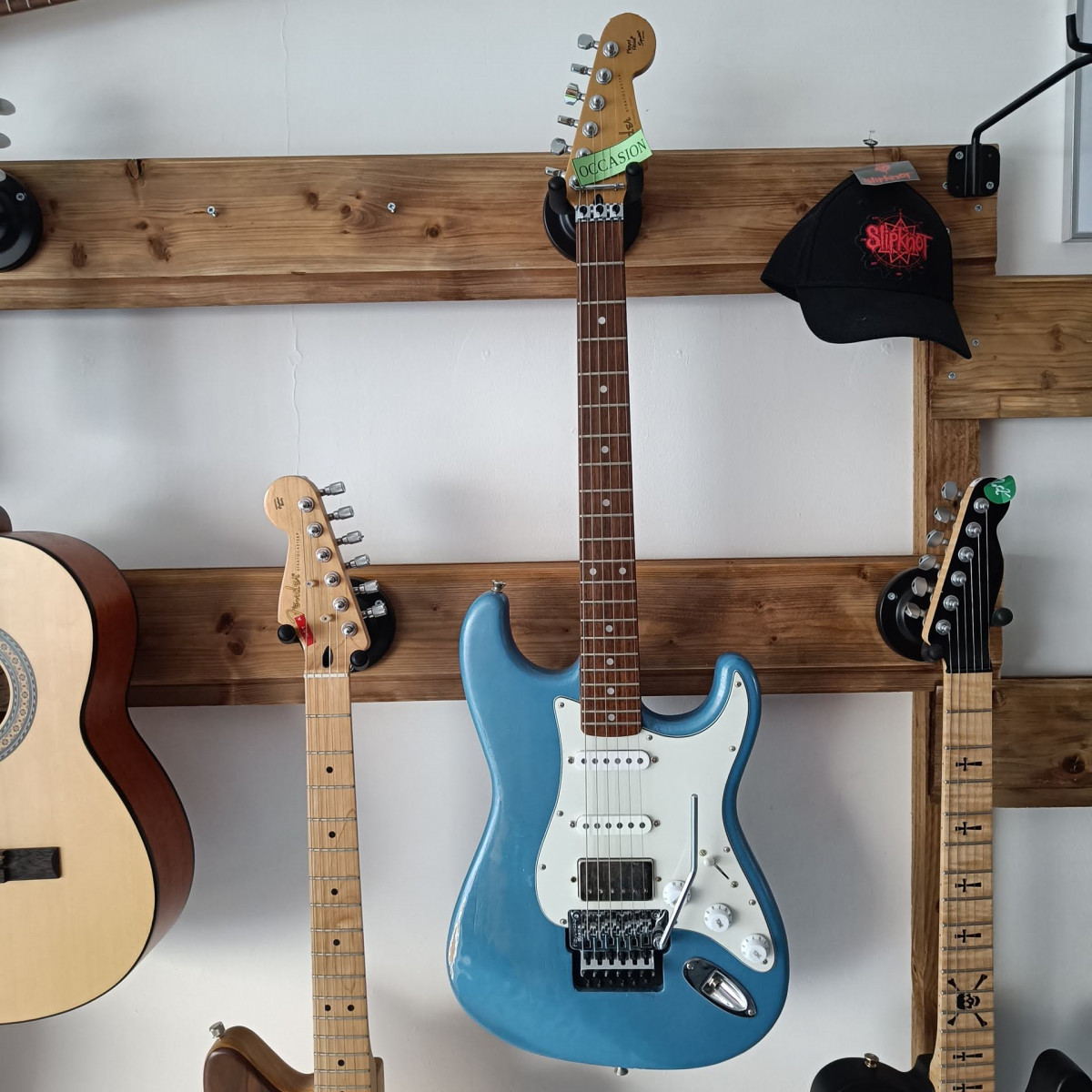 anciennement photoflamme, sa finition partait en plaques, refin nitro perlham blue, micros : dp-100 et deux sp-custom smokey club warm, floyd special neuf, mécaniques gotoh