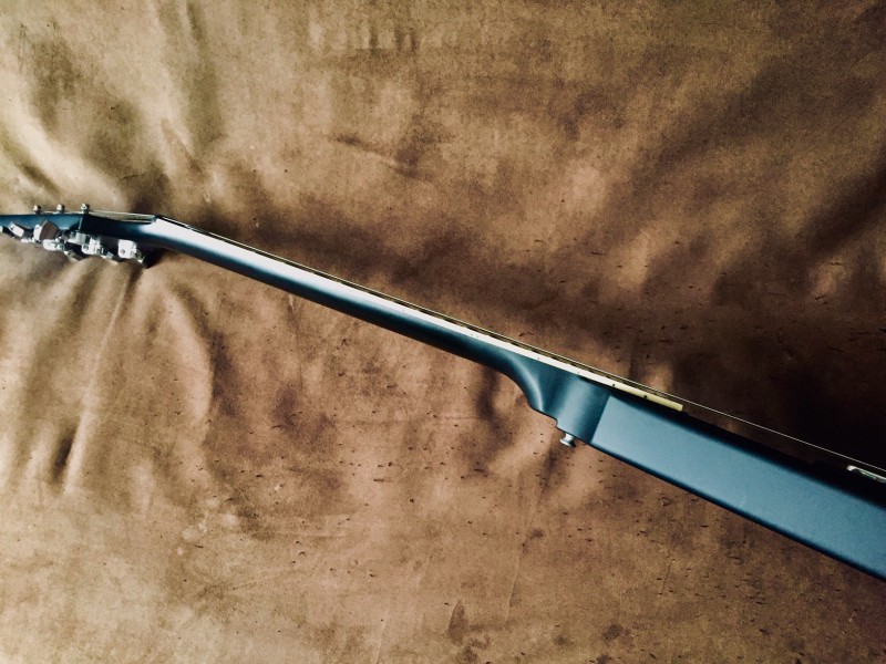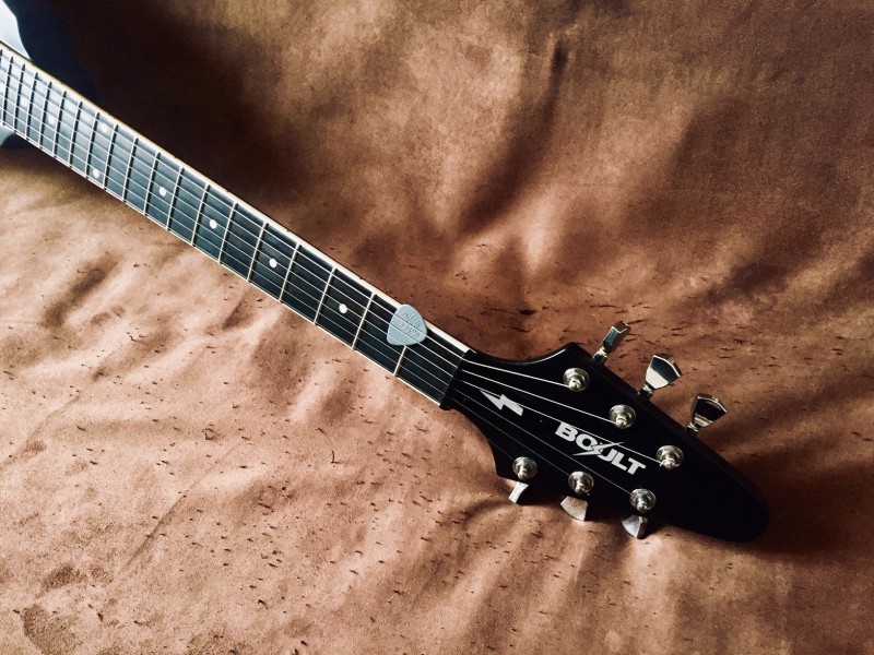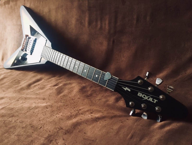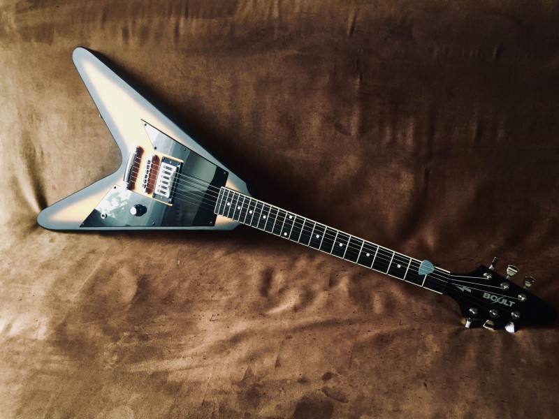 La V est une Boult, marque anglaise disparue fabriquée en Indonésie avec cahier des charges précis et contrôle qualité très pointilleux, corps aulne, manche érable, touche palissandre, finish mat thin faded,le micro installé est maintenant un Kent Armstrong Hot Rod série.
