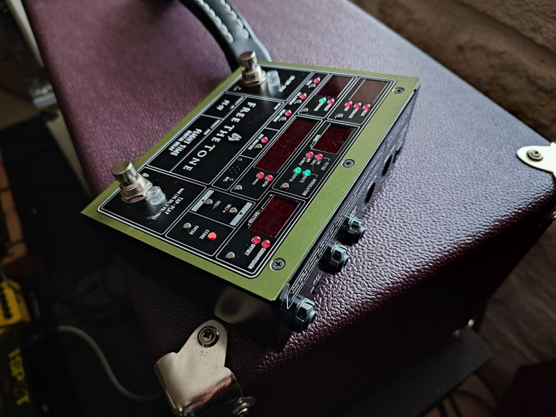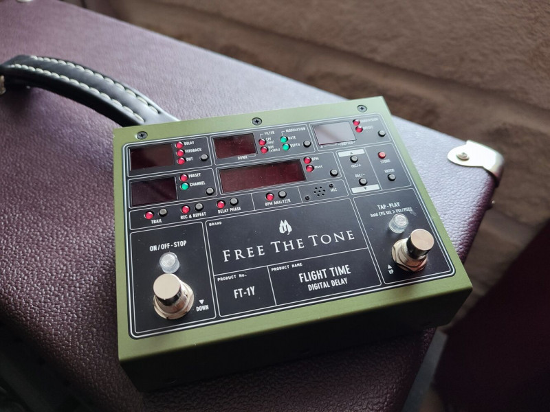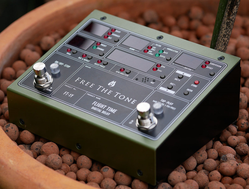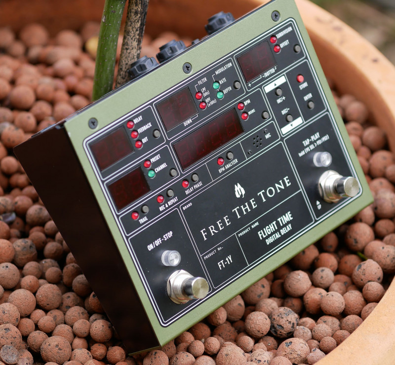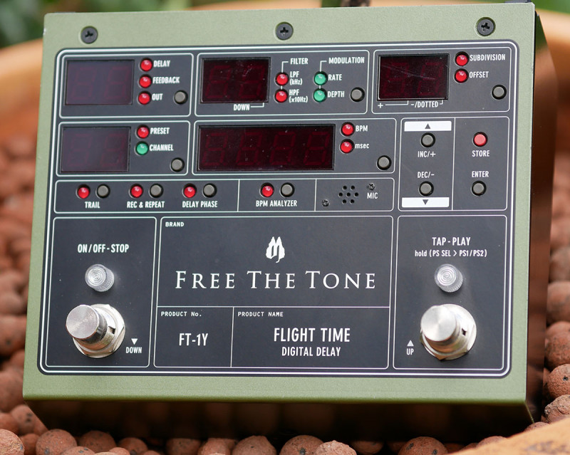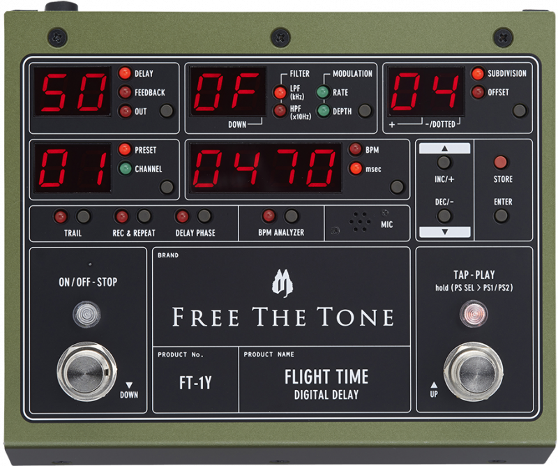 By concentrating a vast amount of accumulated knowledge of analog and digital technologies into its new product “FLIGHT TIME,” Free The Tone has realized a sound quality that goes far beyond other pedal type delay units. With high-speed calculation performed by a 32-bit high-precision DSP, the FLIGHT TIME pursues sonic quality equal to that of famous classic rack type high quality delay units, without using simulation or modeling. Further, the FLIGHT TIME implements two ground-breaking features: Realtime BPM Analyzer and Delay Time Offset. The Realtime BPM Analyzer adjusts the delay time by automatically trimming the BPM based on realtime tempo analysis of the current performance within the range of ±20% of the tempo (BPM) information tap-entered by using a footswitch. Delay Time Offset can shift the delay time slightly against the set BPM by entering the desired numerical value.