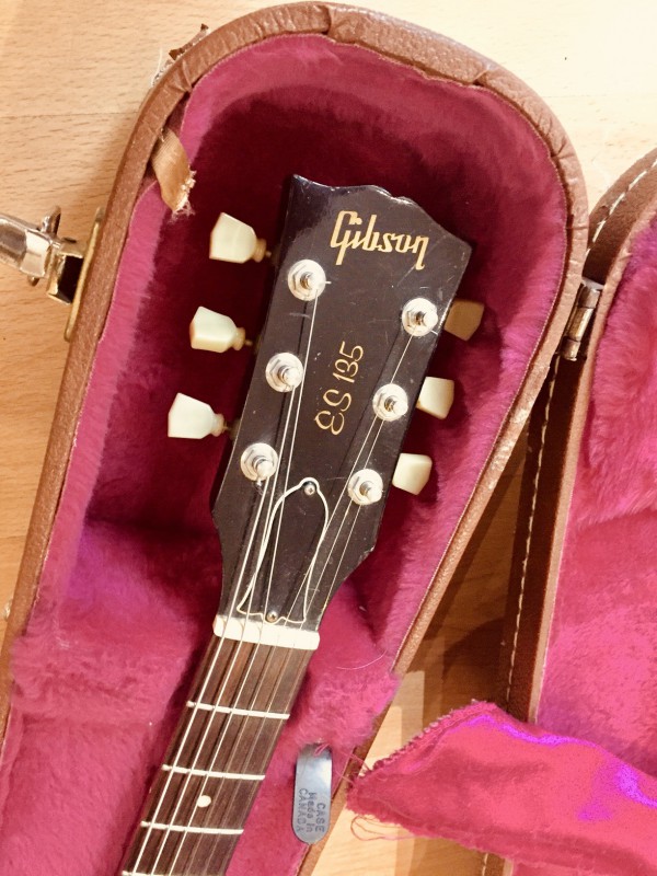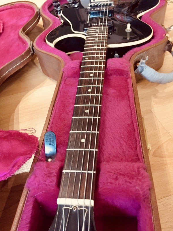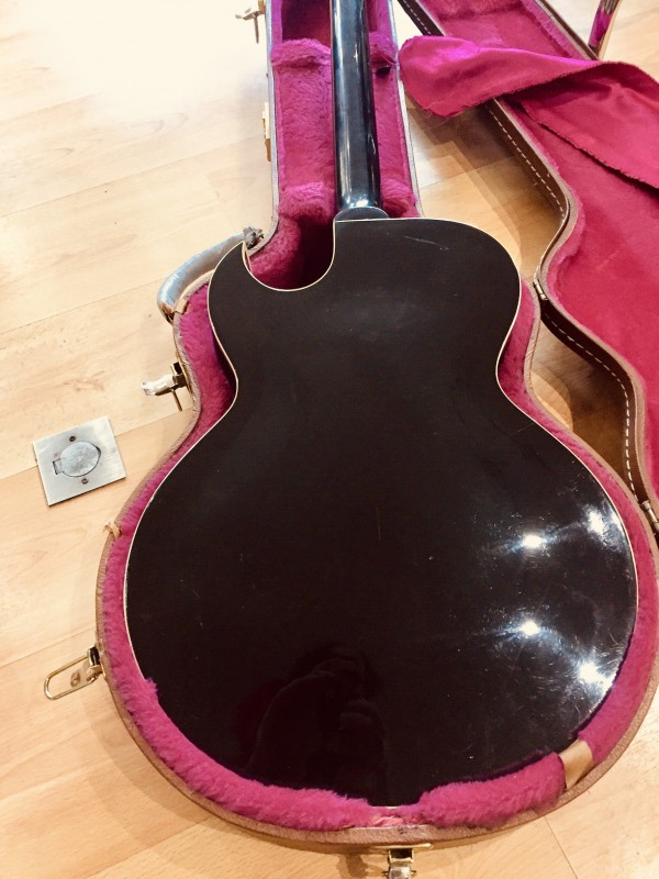 Elle fonctionne très bien et est très bien réglée. J’ai changé le chevalet Nashville d’origine pour un ABR, plus esthétique à mon goût et meilleure intonation. Tout le reste est d’origine. Le case a pas mal bourlingué, signe qu’il a toujours bien assuré sa fonction.