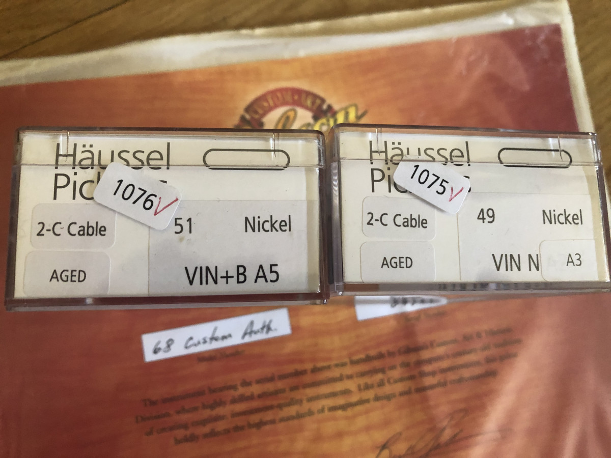 ??Je l’ai upgradée avec des micros Haussel alnico III pour le manche (son type custombucker gibson)et alnico V pour le chevalet (bon niveau de sortie). Ils ont une finition chrome used pour coller parfaitement au reste de l’accastillage. J’ai aussi posé un tom à blocage et un stopbar aluminium, là aussi finition used, pour être en harmonie avec la finition VOS d’origine (notamment des Grover). L’électronique a été aussi upgradée avec un kit CTS appairés. Enfin, elle est équipée de straplocks schaller + une sangle cuir noir. Il y a pour environ 600 euros d’upgrades.