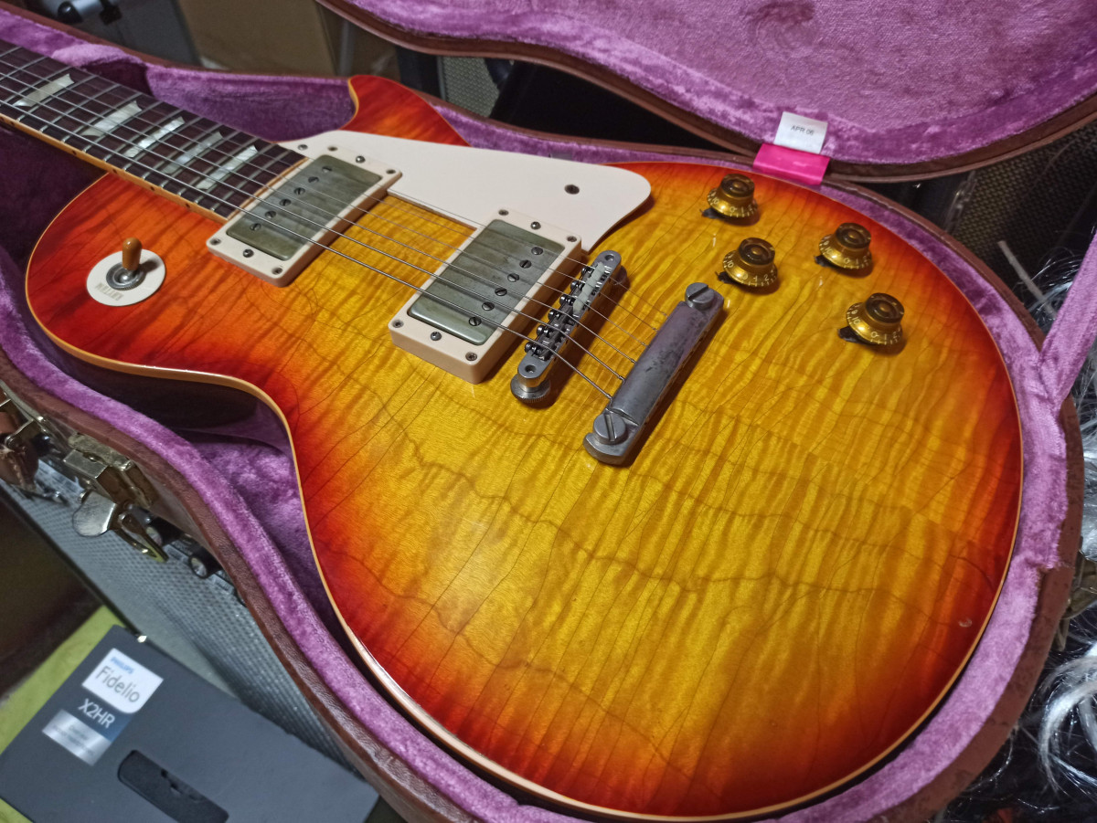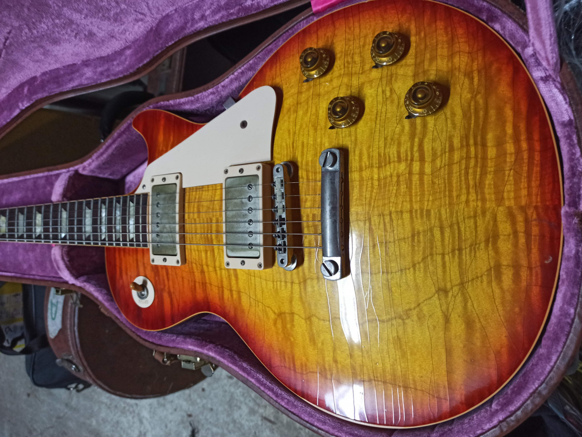 En vente une R0 de 2006. Elle a été revernie et vieillie par RS Guitarworks (certificat disponible). Le vernis est plus fin que l’original Gibson et la guitare résonne comme il faut. Son poids est de 4.1kg. Elle est équipée de micros Manlius Landmark, de très bons micros qui lui donnent un son vintage qui lui va à merveille.