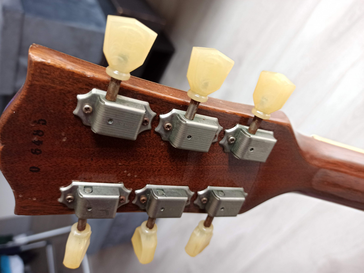 Les boutons argentés d’origine sont dans l’étui Gibson ainsi que les mécaniques d’origine au cas où vous voudriez les remettre. Les premiers ont été changés pour des Montreux Time Machine Collection et les secondes par des Kluson Aged MSSC et amber tip knob. Deux petites options qui dépassent déjà les 200€…