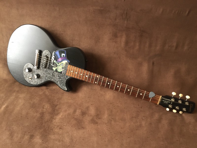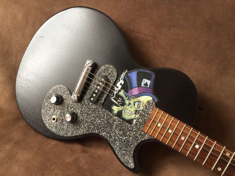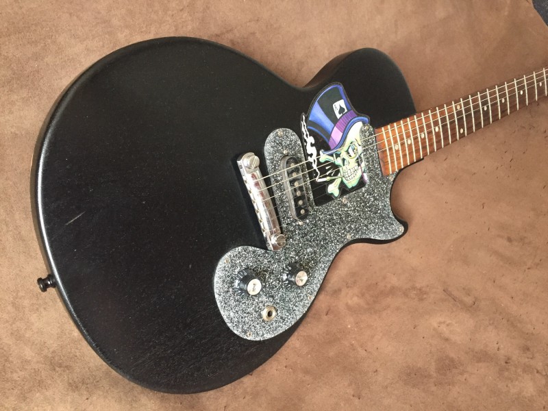 Le pickguard a été remplacé pour un sparkle, le trussrod cover est un custom, et le crâne au chapeau est un sticker qui s'il dérange pourra se retirer sans laisser trace.