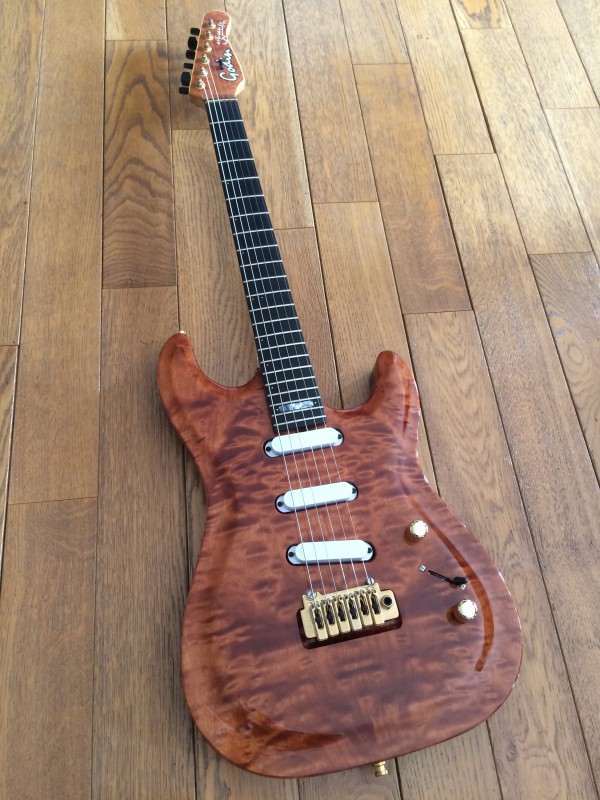 Table en erable pommelé birdseye, touche ebene, manche birdseye de dingue, corps erable, chevalet neuf wilkinson Jap (l’ancien etait franchement fatigué, remplacé par le meme modele japan), meca a blocage schaller…