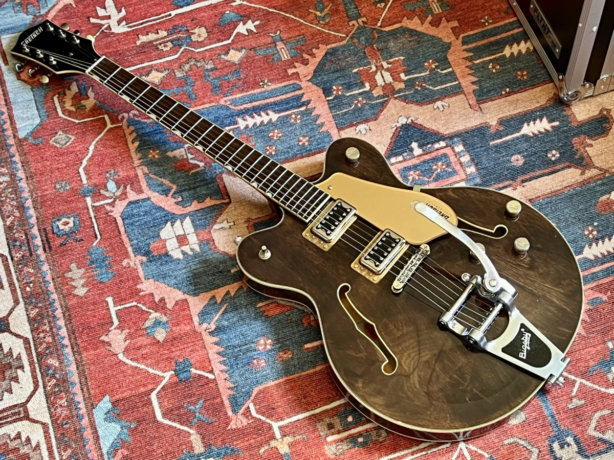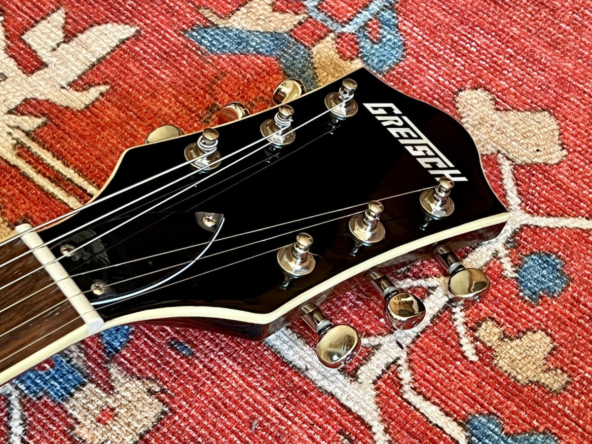 Je mets en vente cette Grestch Electromatic achetée en 2023. C'est une superbe demi-caisse avec bloc central (donc jouable meme avec des sons saturés sans trop de larsen).