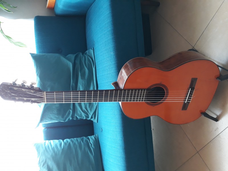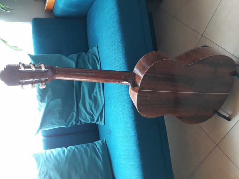 Elle date de 1973 et porte de nombreuses traces attestant son âge et son vécu. Un début de cassure au niveau de la tête a été réparé par un luthier. Le vernis est très marqué, notamment sur la table et le manche. Le fond et les éclisses sont faites avec un magnifique Palissandre de Rio. Les cordes sont un poil hautes et la guitare mériterait un réglage à mon goût. Les mécaniques ne sont pas celles d'origine. Le son est authentique 'bossa', des basses profondes... N'hésitez pas à venir la tester dans le sud 77 (Fontainebleau).