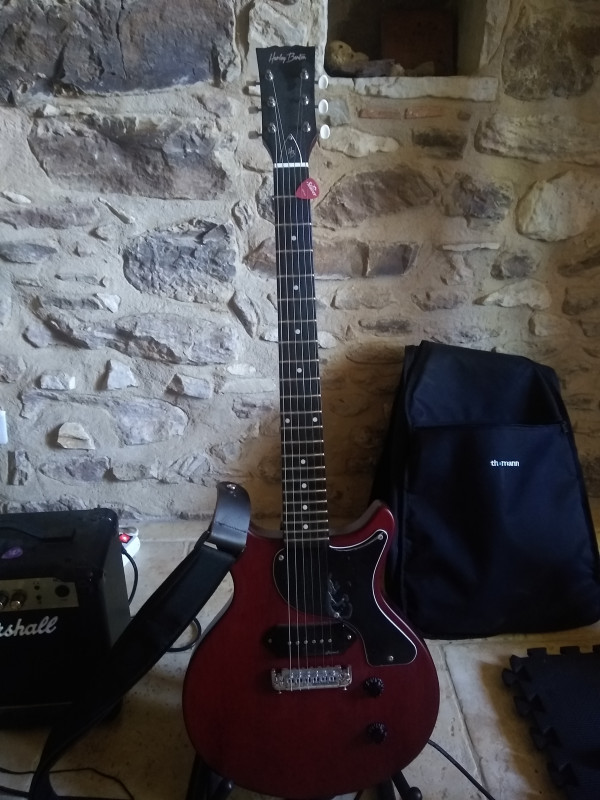 A la vente: une Harley Benton DC-Junior Faded Cherry en très bon état sauf un coup à l'arrière (voir 2ème photo)