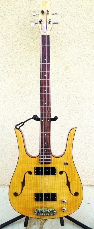 je vends une basse d'inspiration danelectro longhorn... mais elle n'a rien à voir avec une danelectro. d'abord c'est une basse de luthier (daguetguitars) faite en "vrai bois" Orme plus que centenaire pour le corps et frêne ondé pour la table, érable et wengé pour le manche avec une touche en bois de violette de toute beauté, les micros sont des pièces uniques suivant un tout nouveaux design magnétique qui apporte plus de dynamique et de sensibilité et moins de bruit de fond que ndes simples ordinaires. il y a un article dans bassiste magazine par Paolo Coccina qui paraitra fin Aout, elle est neuve... et en fait je voudrais en commander une plus personnalisé mais pareil... au même luthier.(d'autres photos sur demande)