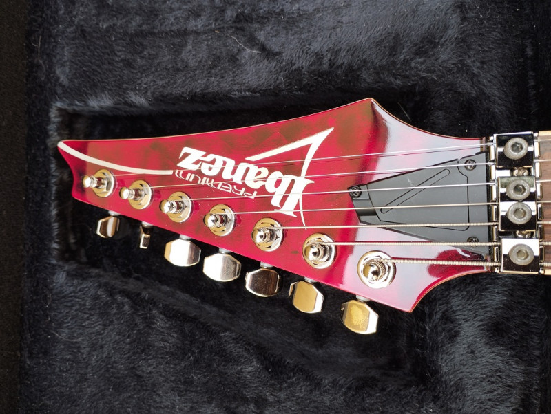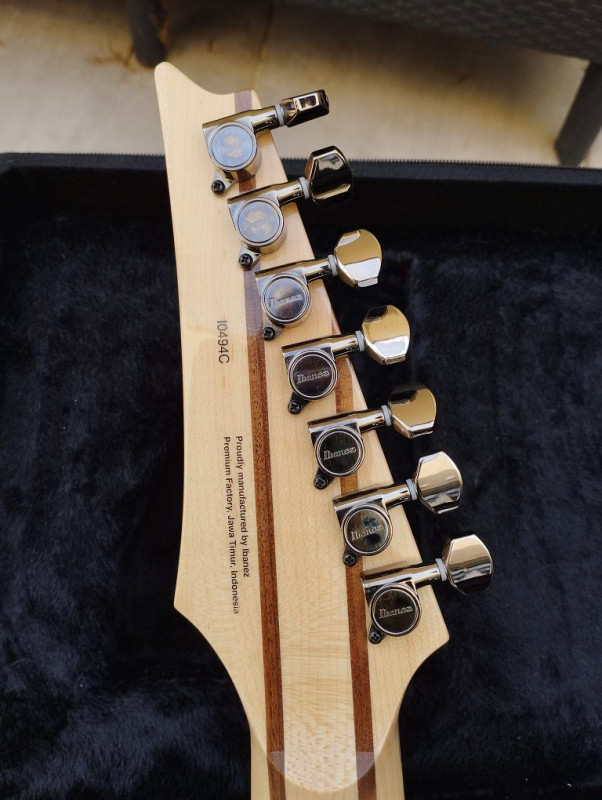 Fabrication indonésienne, table érable pommelé vernis gloss, manche 5 plis vernis satiné, tête érable pommelé vernis gloss, touche en palissandre 24 cases, vibrato Ibanez Edge-Zero II, accastillage "chromé" (ressort doré sur les photos à cause de la réflection du mur ocre), micros d'origine DiMarzio IBZ 7. Cordes Ernie Ball Regular slinky 10-56 installées.