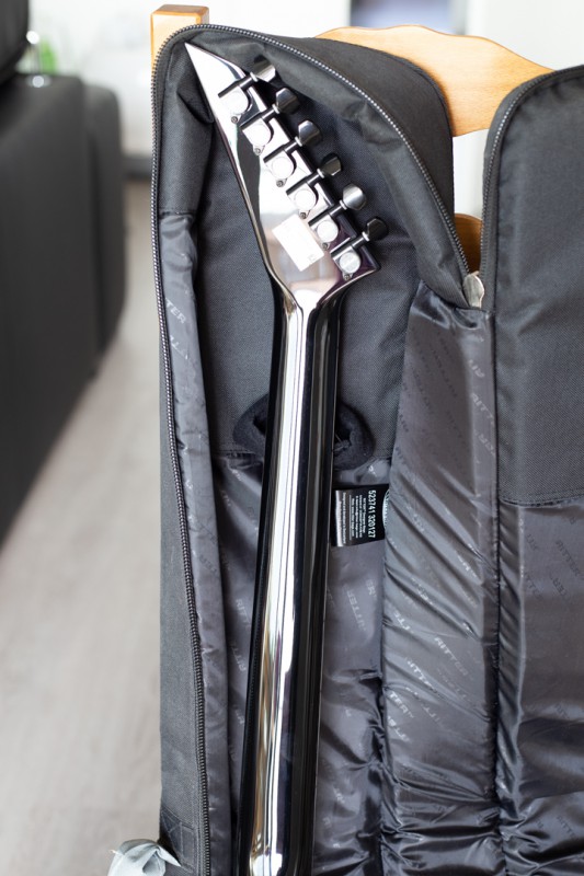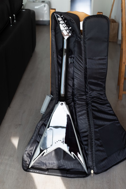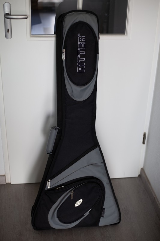 La housse flying V de marque Ritter est fournie avec. Seul bémol, une partie des courroies permettant de transporter la housse a été un peu grignotée par un de mes rats qui s'était fait la malle (voir photo).