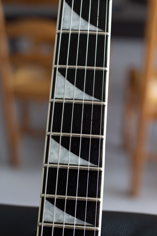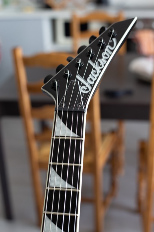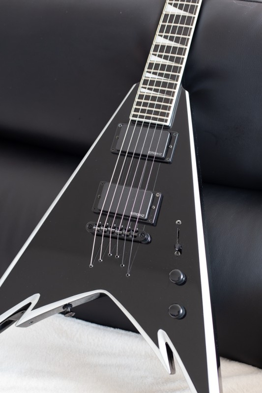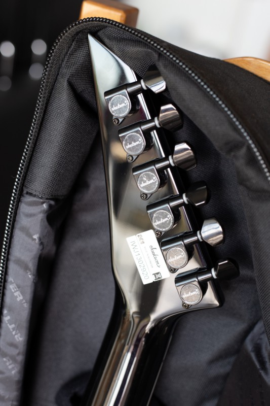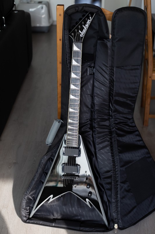 Jackson Phil Demmel PDXT King V BK achetée neuve en 2015 chez Thomann. Je ne l'ai utilisée que durant 1 an uniquement en intérieur. Elle n'a subit aucun poc, les seules altérations sont des micro-rayures sur la table.