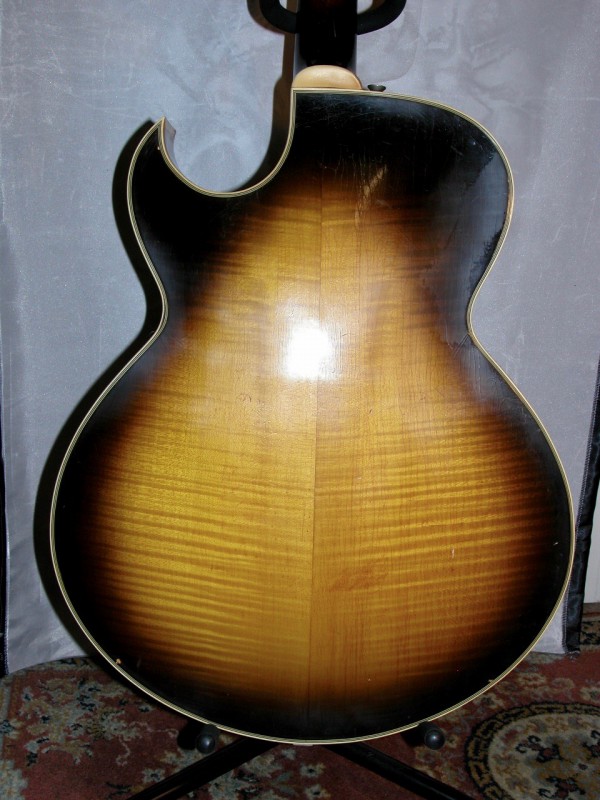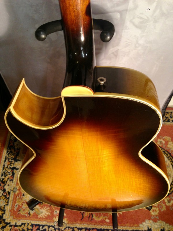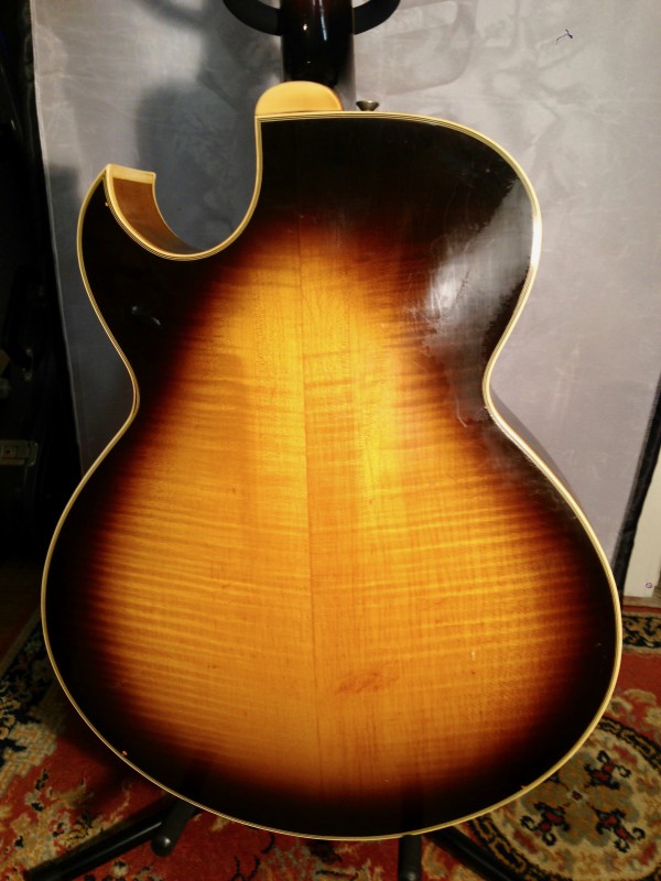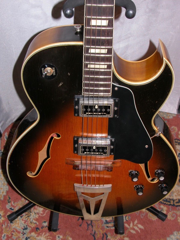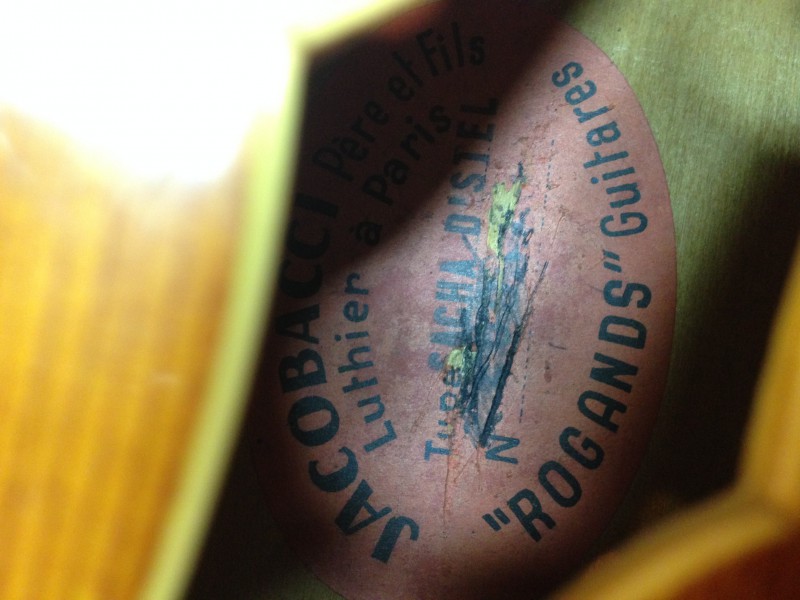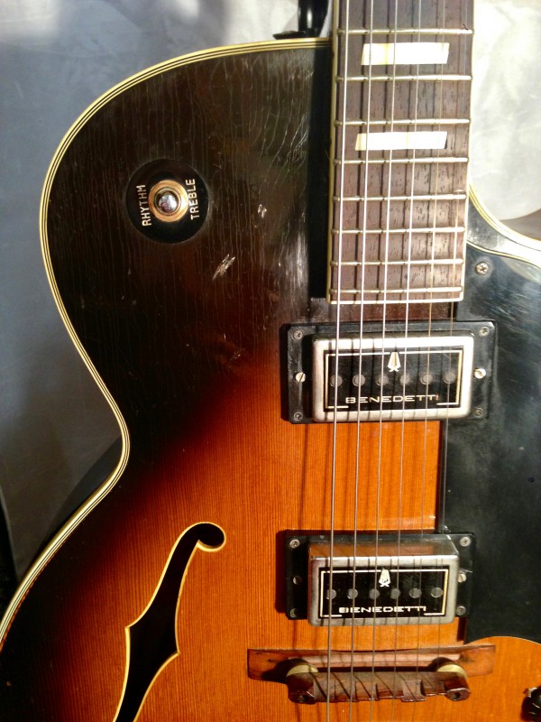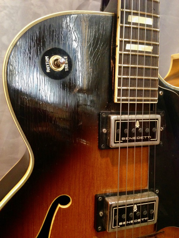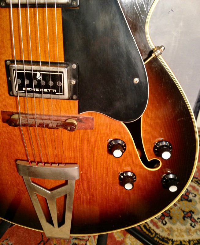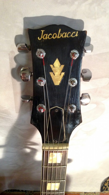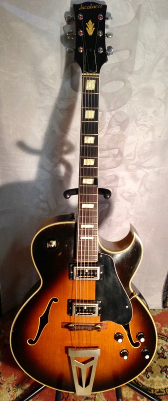 Marre des guitares neuves? Plein de mojo avec ce très bel exemplaire du modèle Sacha Distel des frères Jacobacci, luthiers à Paris souhaitant à l'époque fabriquer une meilleure Gibson ES-175!