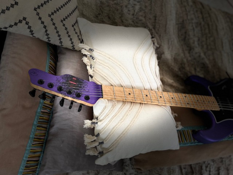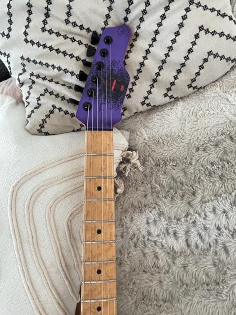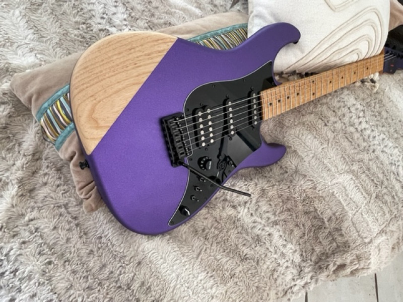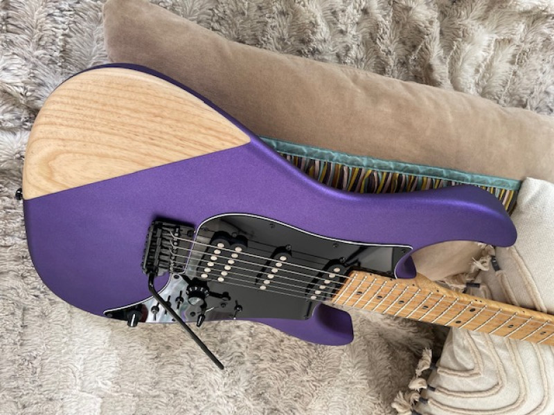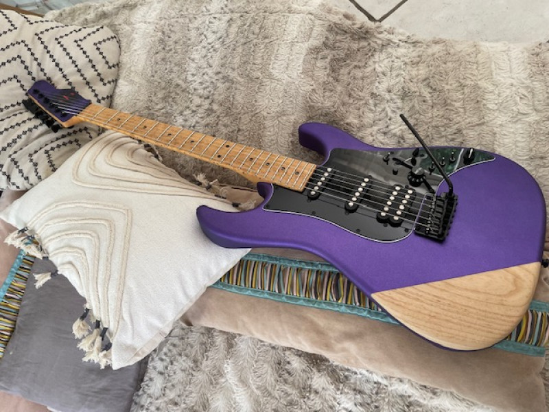 Pour les spécifications, c’est un manche érable bird’s eye sublime, vernis satiné mat finition Purple metallic, état des frettes parfait, un confort excellent. Manche profil 59 classique de chez Tyler, un must.