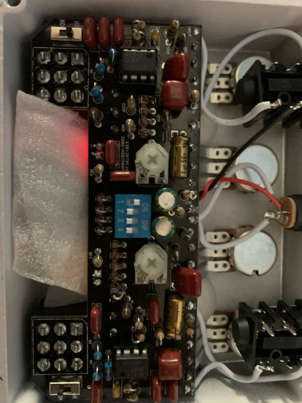 Ce sont les mêmes composants, réglages et dip switches que sur l'original et en plus, elle a deux interrupteurs où l'on peut changer de Normal vers High Gain sur les deux canaux !