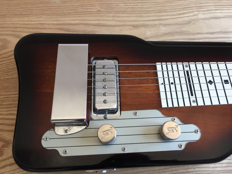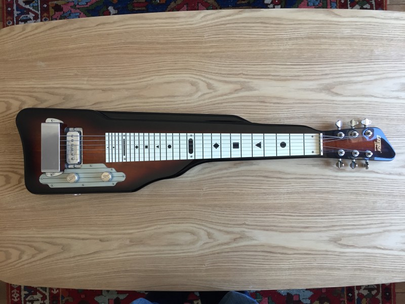 J’avais acheté ce lapsteel à un musicien il y a quelques années, mais ne m’en sers plus. Il est en très bon état, quelques petits pocs par ci par là, mais que je n’arrive pas à prendre en photo (petits donc, très peu visibles), et il fonctionne parfaitement. Je trouve, sans être un spécialiste du lapsteel, que c’est un très bon instrument pour débuter sans se ruiner. Le micro sonne vraiment bien, avec un bon niveau de sortie.