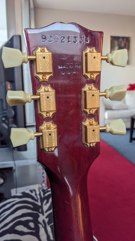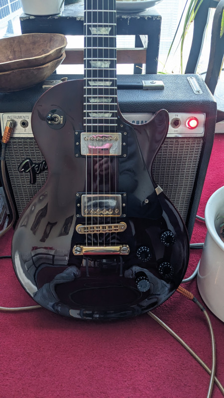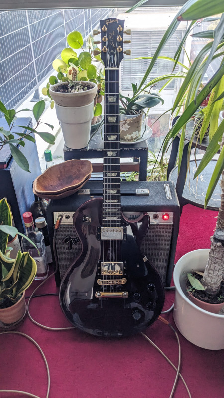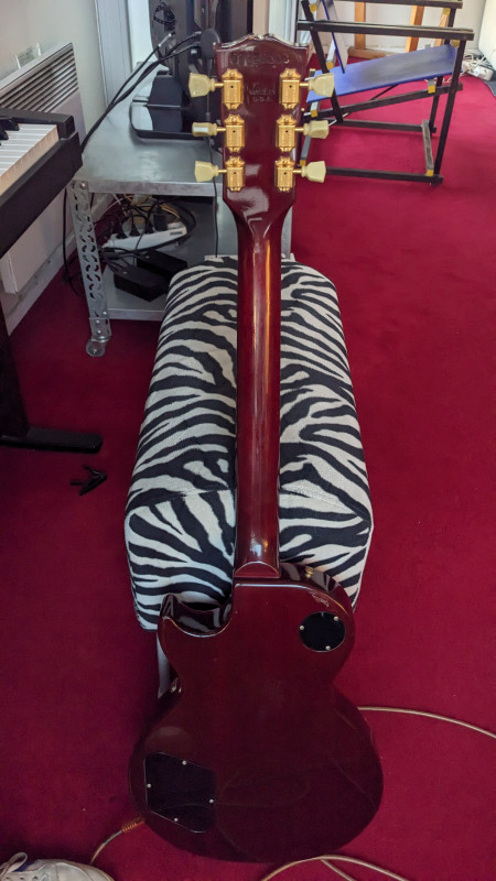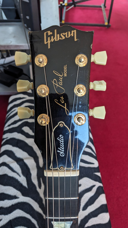 Je vends une Gibson LP Studio de 91, touche ébène, micros et accastillage dorés et tout le toutim d'origine.