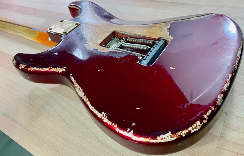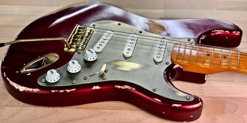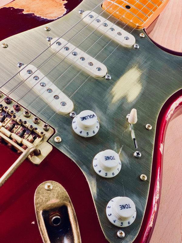 Corps Alder Strat fabriqué par Wildwood Manufacturing en Californie, aux États-Unis, Checking Marks et peinture faites par Mark Jenny de MJT Custom Aged Guitar Finishes aux États-Unis en 100% nitrocellulose Candy Red Apple et HeavyRelic faits par S71 Custom Guitars, fortement inspiré par la Fender 1964 Candy Red Strat de mon ami JOSH STEELY guitariste de DAUGHTRY, en particulier le dos du corps. Manche très haut de gamme AllParts de style CBS «tête large» fabriqué aux États-Unis sous licence Fender et vieilli en nitro ambre. Micros Fender Noiseless Vintage première generation fabriqués aux États-Unis, utilisés dans les modèles Clapton et Jeff Beck Signature Strat. Electronique câblée à la main avec spécification Vintage, condensateur Pio et «6-sounds Stratocaster». Mécaniques Kluson et vibrato Fender USA fabriqués par AllParts à Houston avec des pontets gravées et fini en Gold Aged.