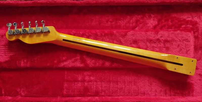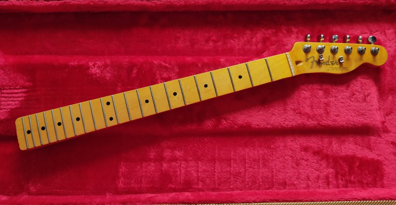 Bonjour à tous, suite à un abandon de projet, je vends un manche de Telecaster type Vintage, érable, profil C, radius 9.5, frettes Jumbo (quasi neuves), largeur au talon : 56mm, mécaniques étagées Wilkinson, logo Fender 50's. Le manche est d'origine Japonaise (Hosco).