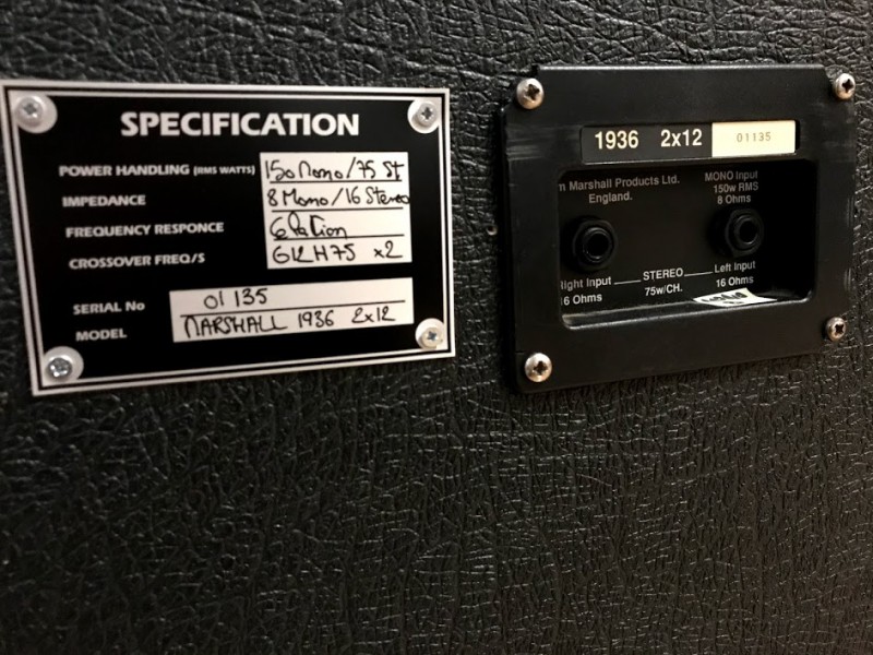 - d'une petite plaque à l'arrière pour se rappeler des Hp montés à l'intérieur, et donc de la puissance et impédance du cab (le baffle a été à une époque monté en greenback et V30).