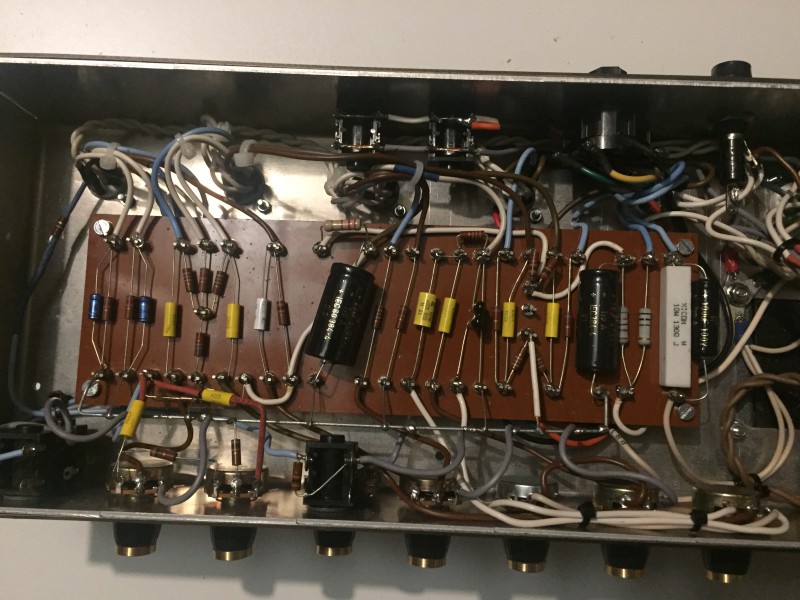 2 canaux, le normal identique à l’original (fabuleuse plateforme à pédales!) et un canal ou le tremolo d’origine a été remplcé par un tone stack + un master volume.
