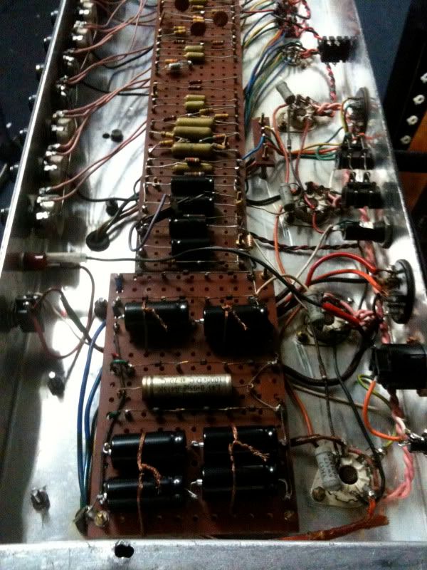 *tous les condensateurs d'alimentation ont été changés par prudence (ceux d'origines fonctionnaient mais vu les tensions en jeu dans l'ampli et la rareté de l'ampli, pas de risques!! Les condos d'origines seront fournis avec.)