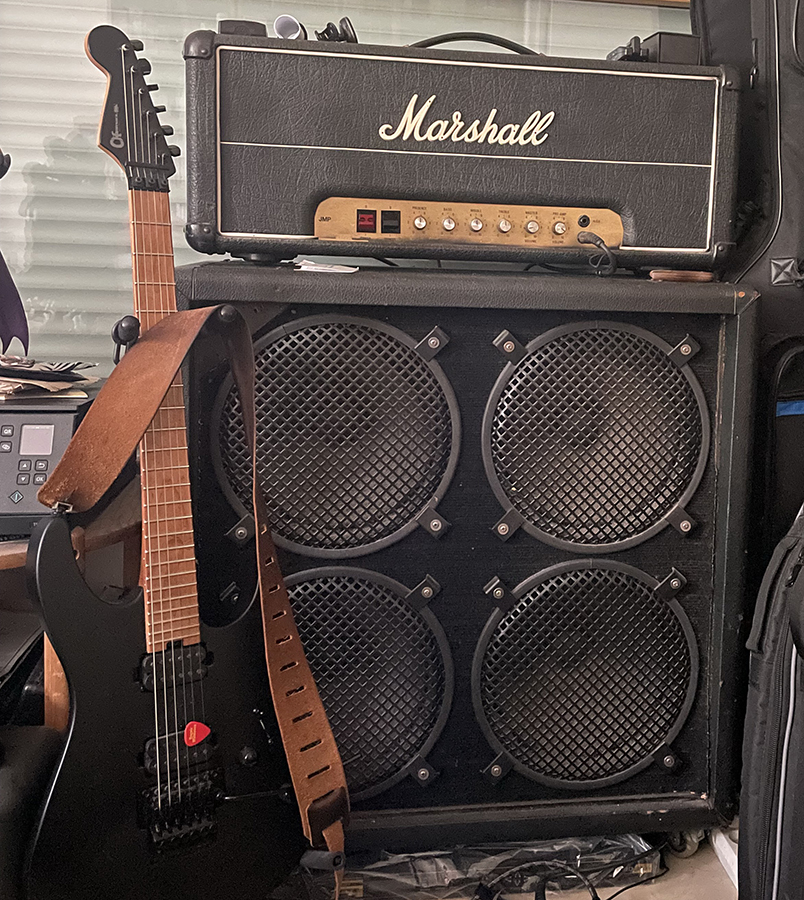 Le baffle qui est un Marshall d'époque n'est PAS a vendre. l'ancien propriétaire avait retiré la toile beige, j'ai donc mis un bout de moquette noire + 4 grilles )