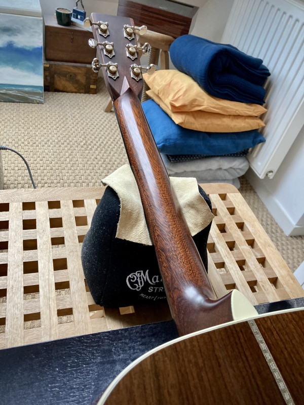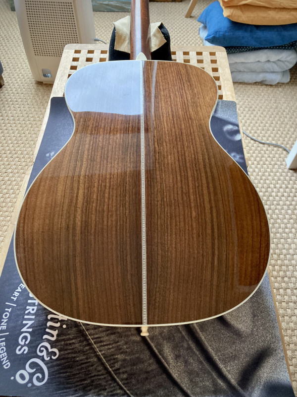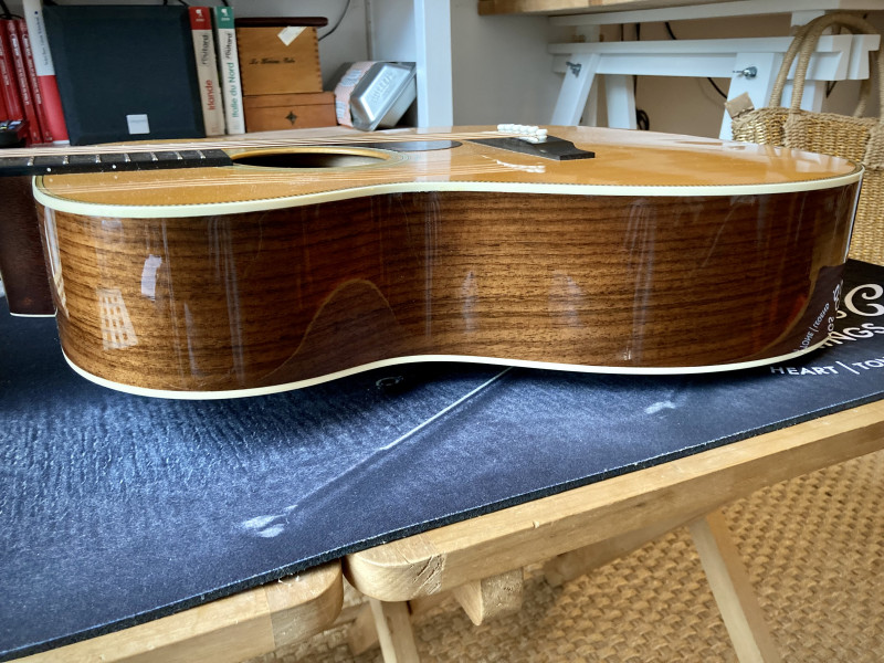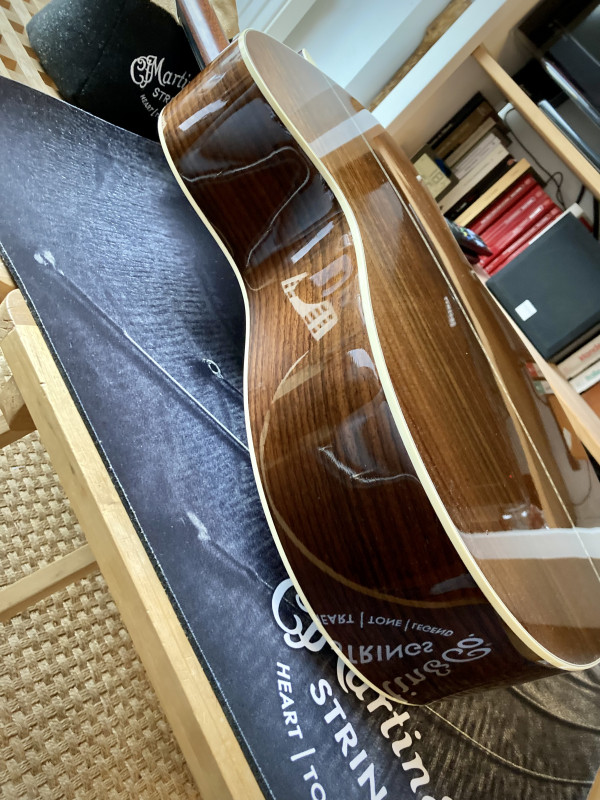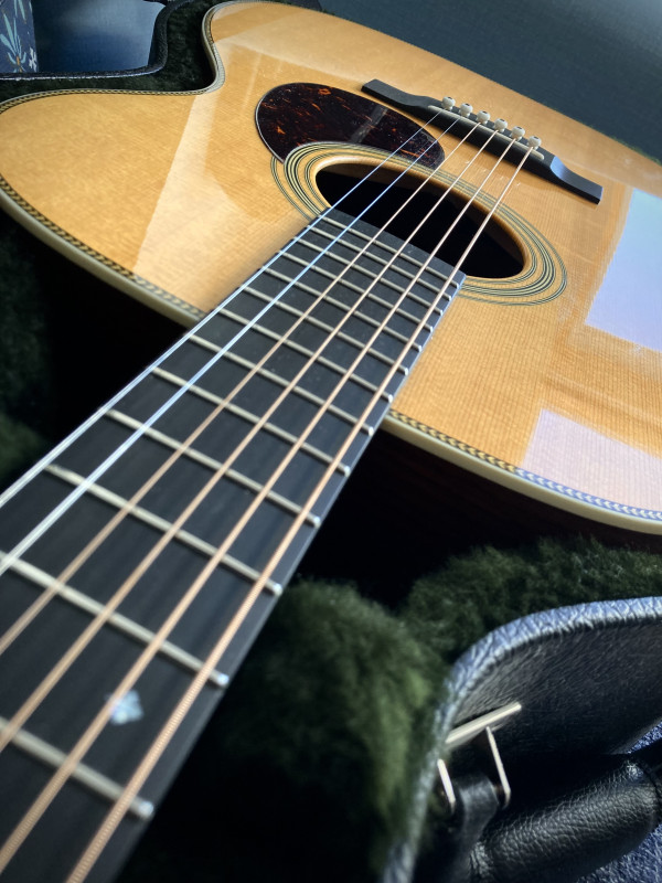 Attention, point très important : elle a été refrettée et réglée par Franck Cheval en novembre 2022 (facture à l’appui) et n’a pas été jouée depuis (achat d’une 000-28 entretemps).