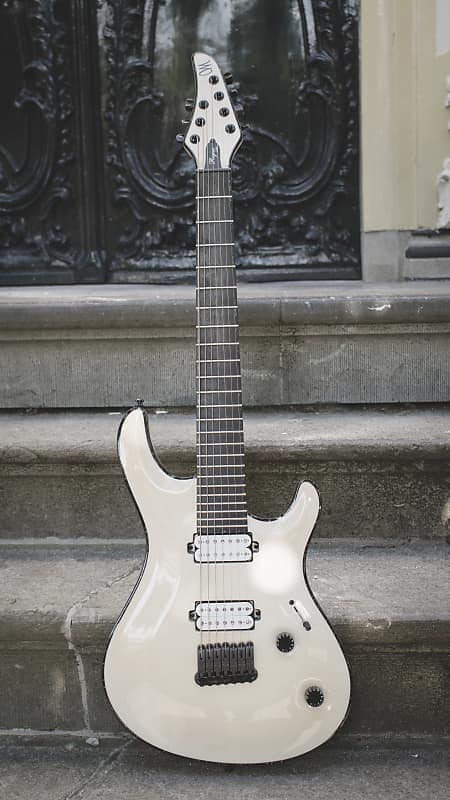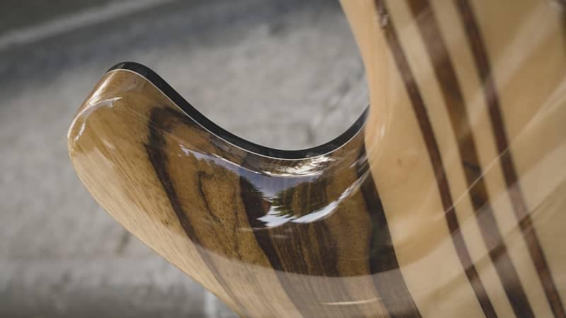 Corps en limba noir 3a en érable flammé, manche érable 11p / acajou / amazone et wengé, touche en ébène, 5.4, luminlay vert, barknuckle painkiller