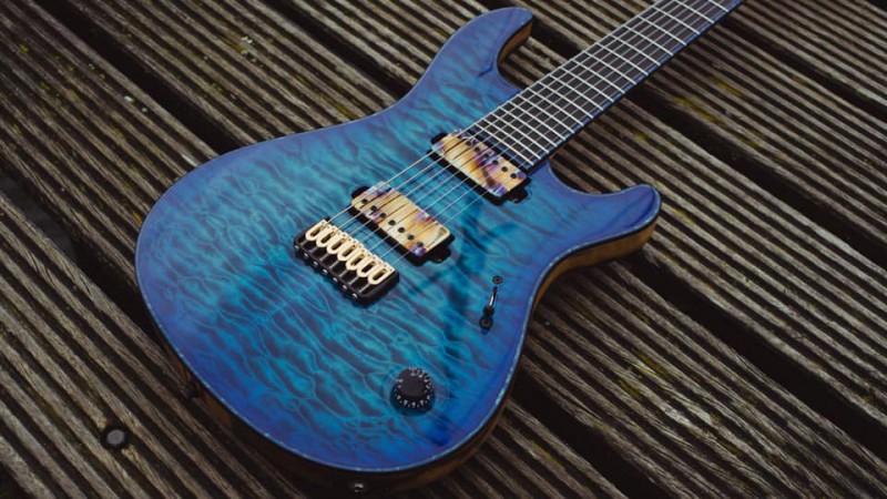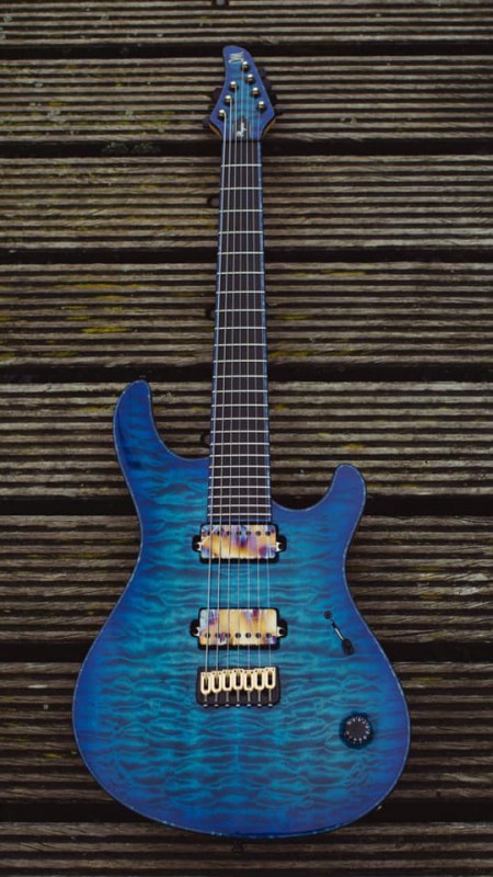 limitée à 3 exemplaires. Top en érable 5a, corps en limba noir, manche érable 11p / acajou / amazakoe et wengé, touche en ébène, 25.4, luminlay, bareknuckle ragnarok