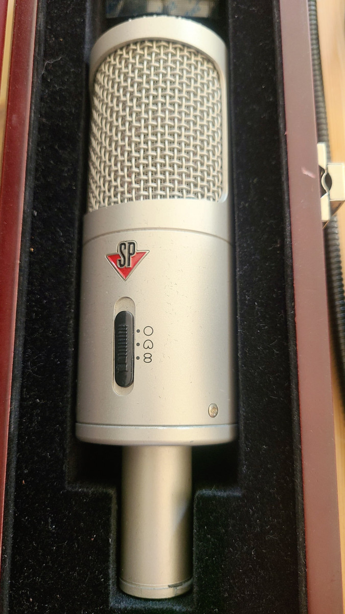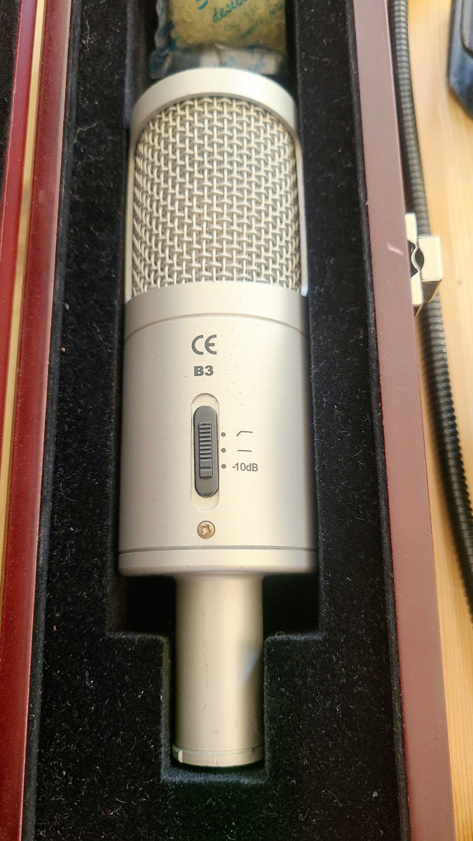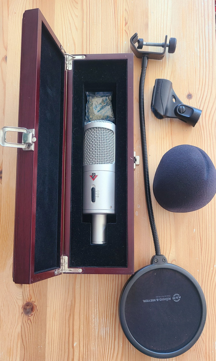 Il est livré dans son écrin en bois, avec une pince micro, une bonnette anti-vent et un filtre anti-pop K&M, et je dois avoir la boîte d'origine quelque part.