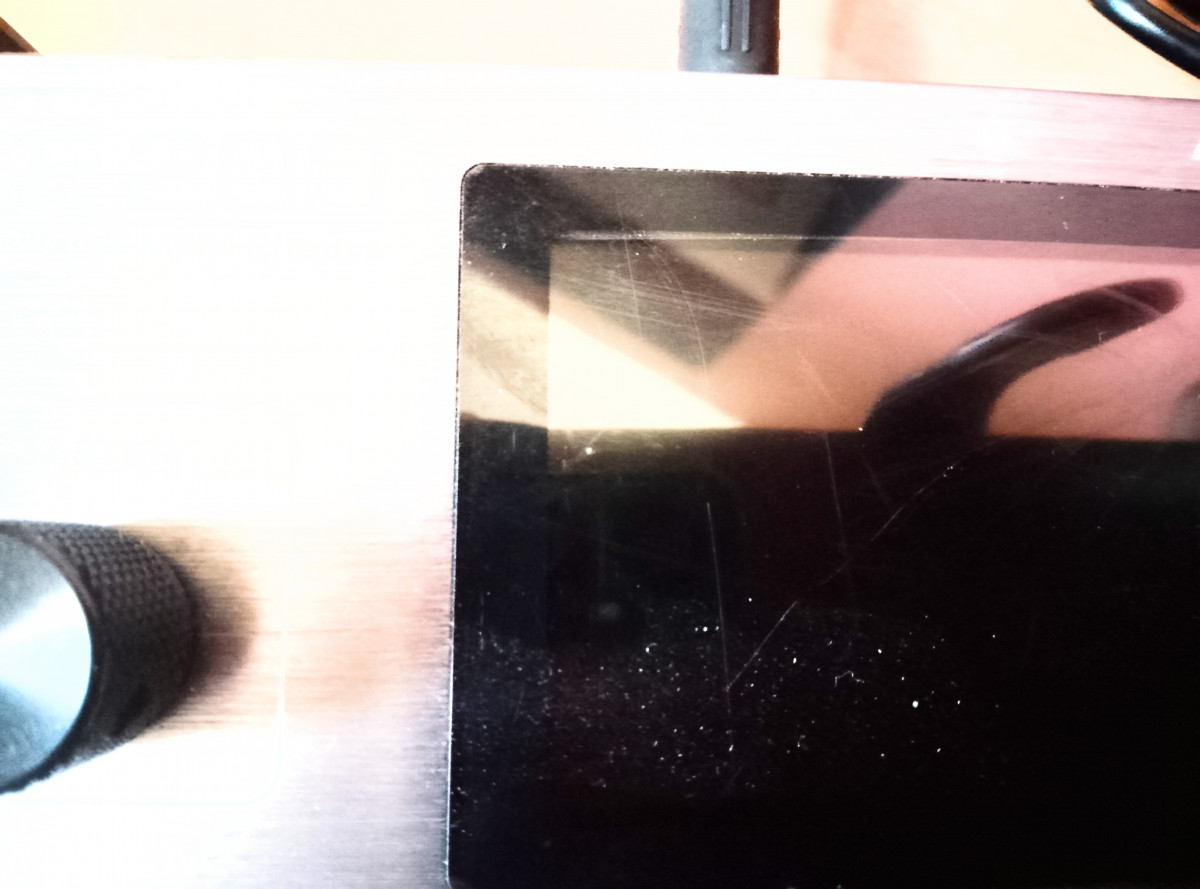 Il y a des micro rayures sur l'écran, j'ai tenté de le prendre en photo et j'ai modifié le contraste pour le mettre en évidence (dans les faits c'est moins visible, voire invisible écran allumé)